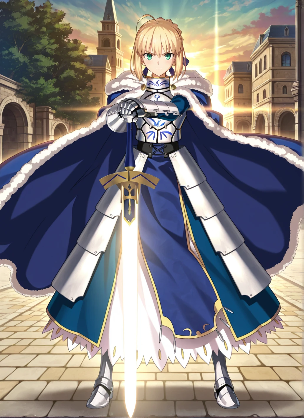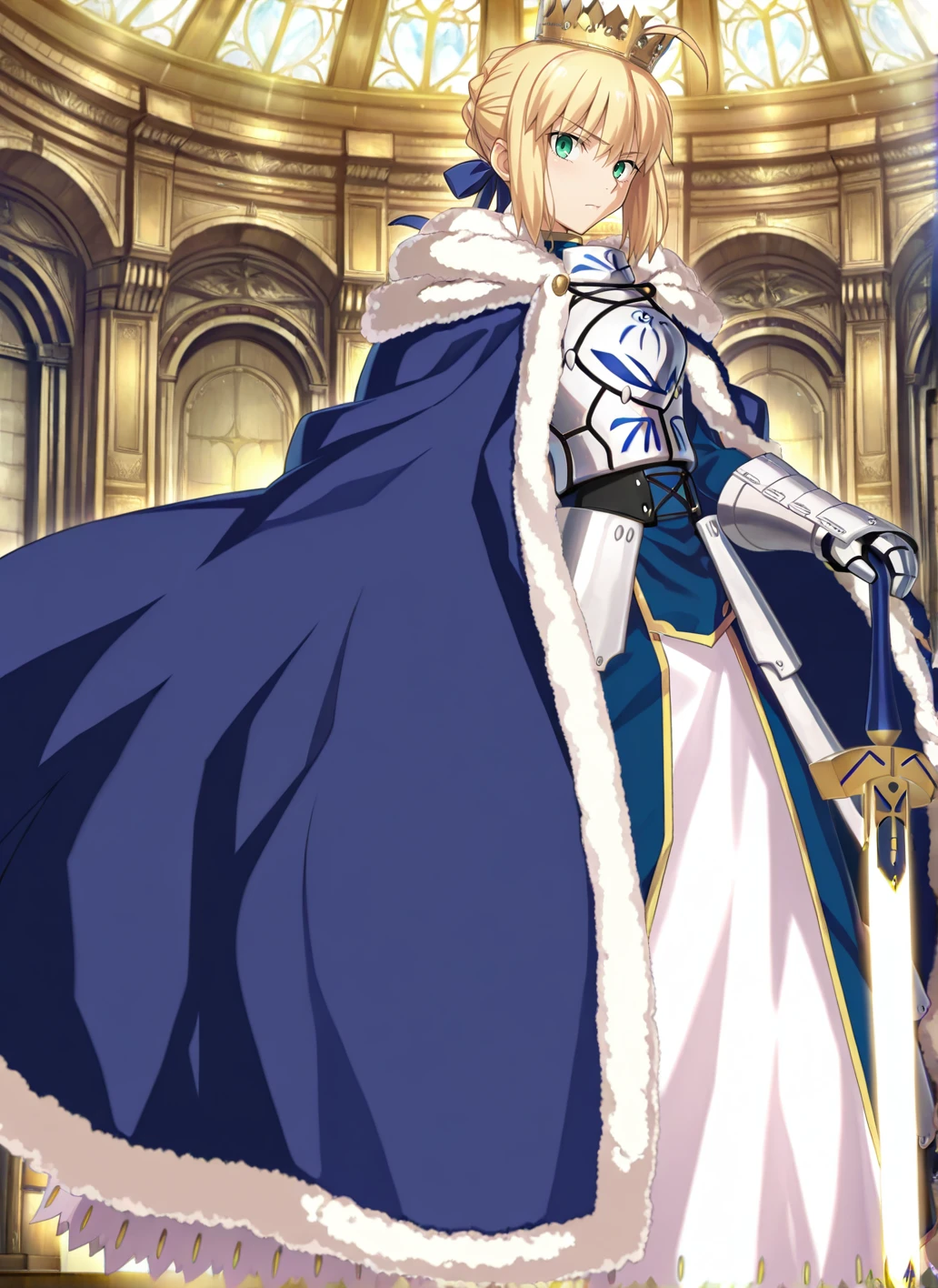 artoriapendragonfgo, 1girl, blonde hair, ahoge, dress, green eyes, plate, crown, cape
