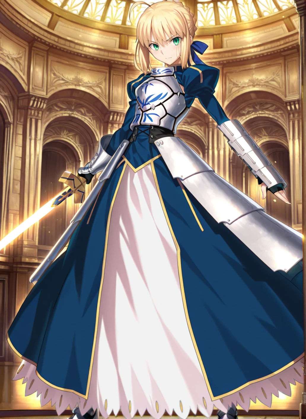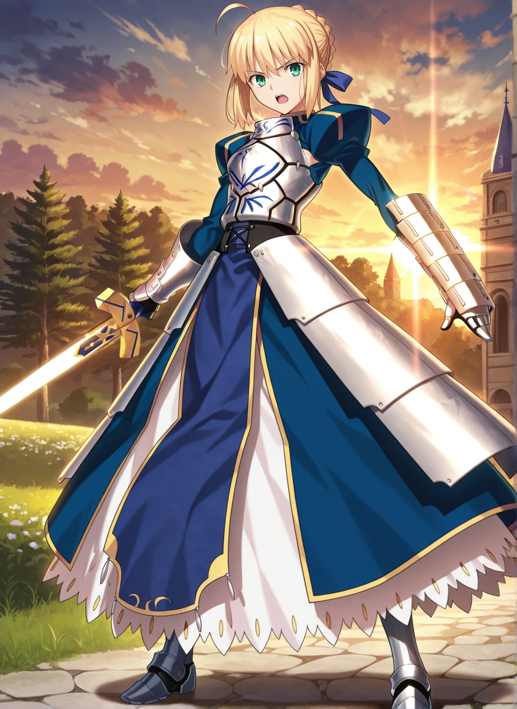 artoriapendragonfgo, 1girl, blonde hair, ahoge, green eyes, armor, dress, plate,