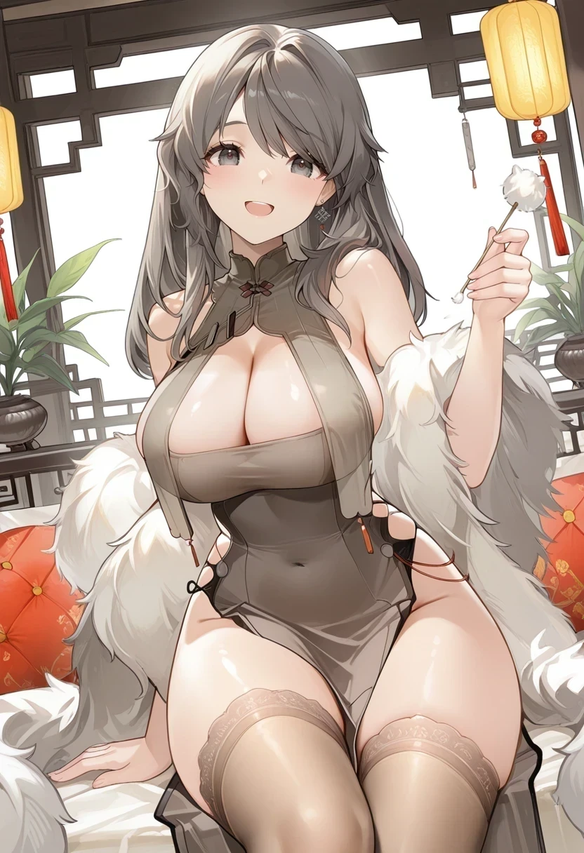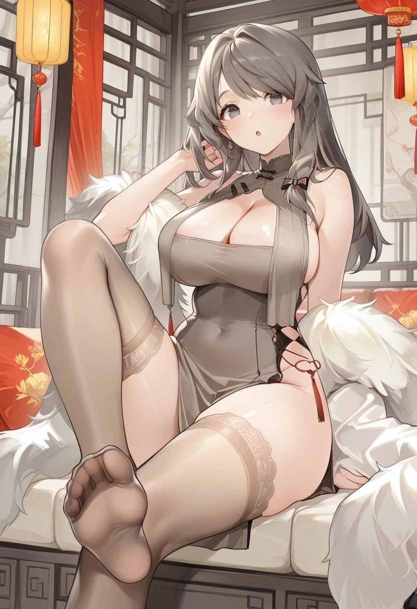 china dress,cleavage, lace-trimmed legwear, feather boa,