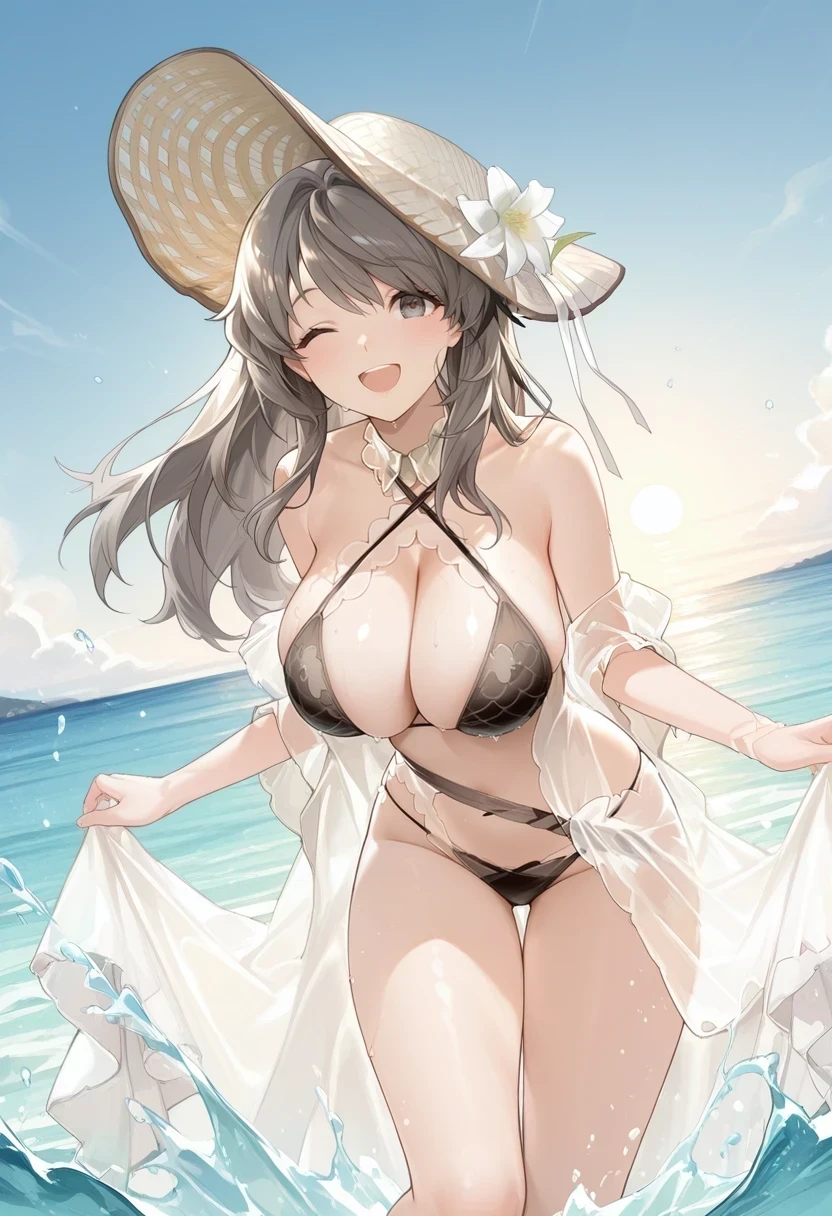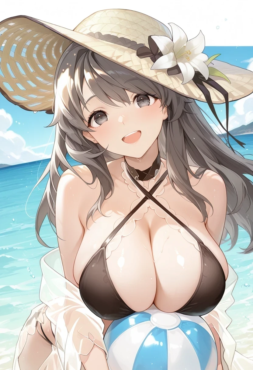 black bikini,criss-cross halter,see-through,sun hat,hat flower,