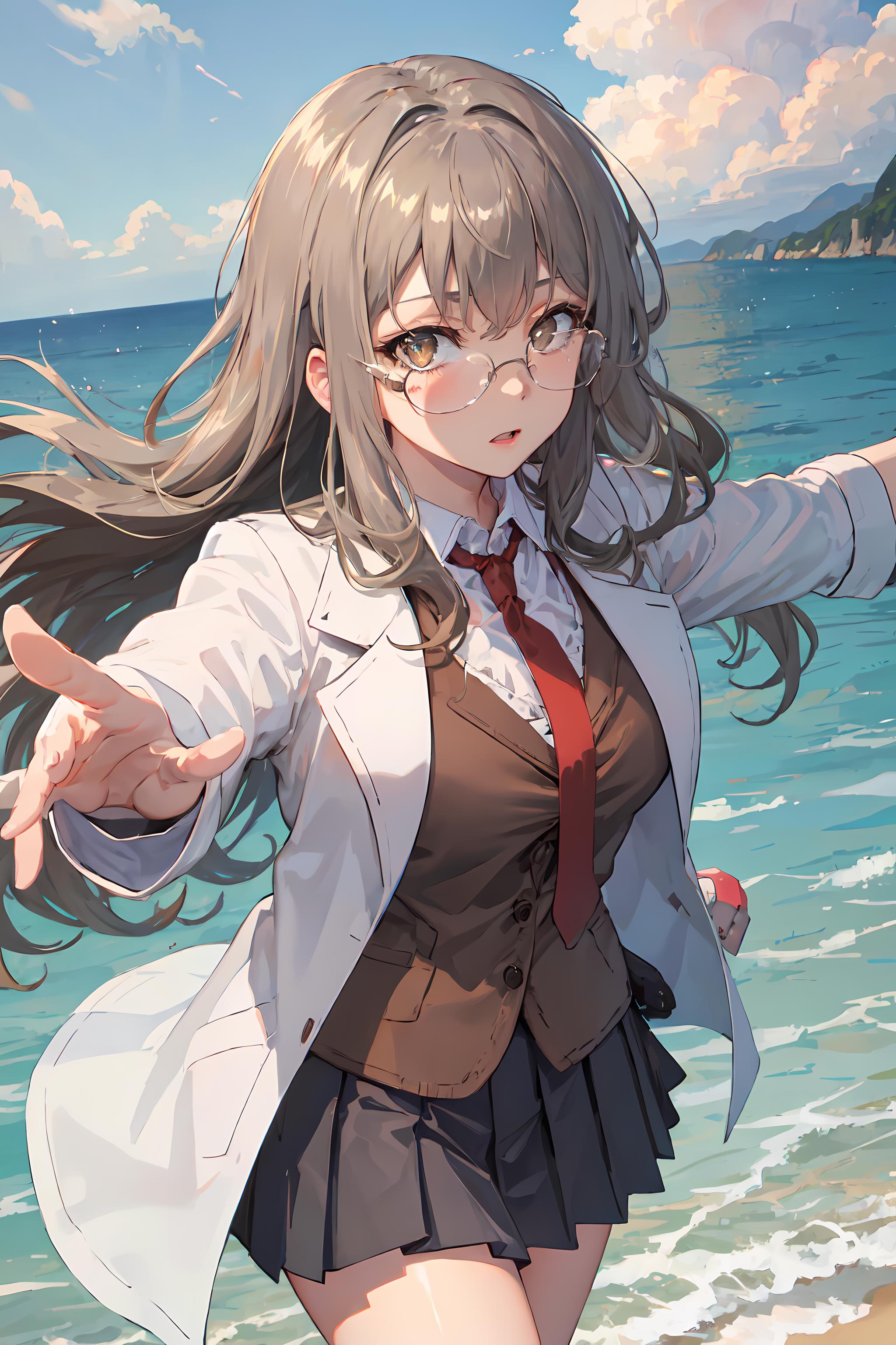 Example Output: riofutaba, ashe brown hair, long hair, brown eyes, glasses, outfit1, labcoat, brown blazer, blazer, white shirt, red necktie, pleated skirt