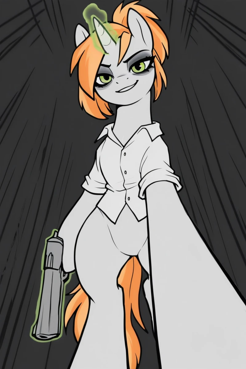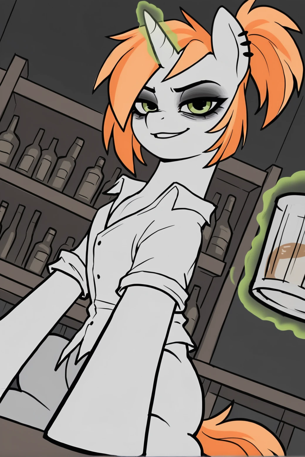 L0s3rc1ty_uncrn, solo, female, unicorn horn, pony, feral, animal ears, ear piercing, white body, monotone body, green eyes, black eyeshadow, eye bags, orange hair, long hair, straight hair, two tone hair, swept bangs, snout, ponytail, animal tail, orange tail, two tone tail, hooves
