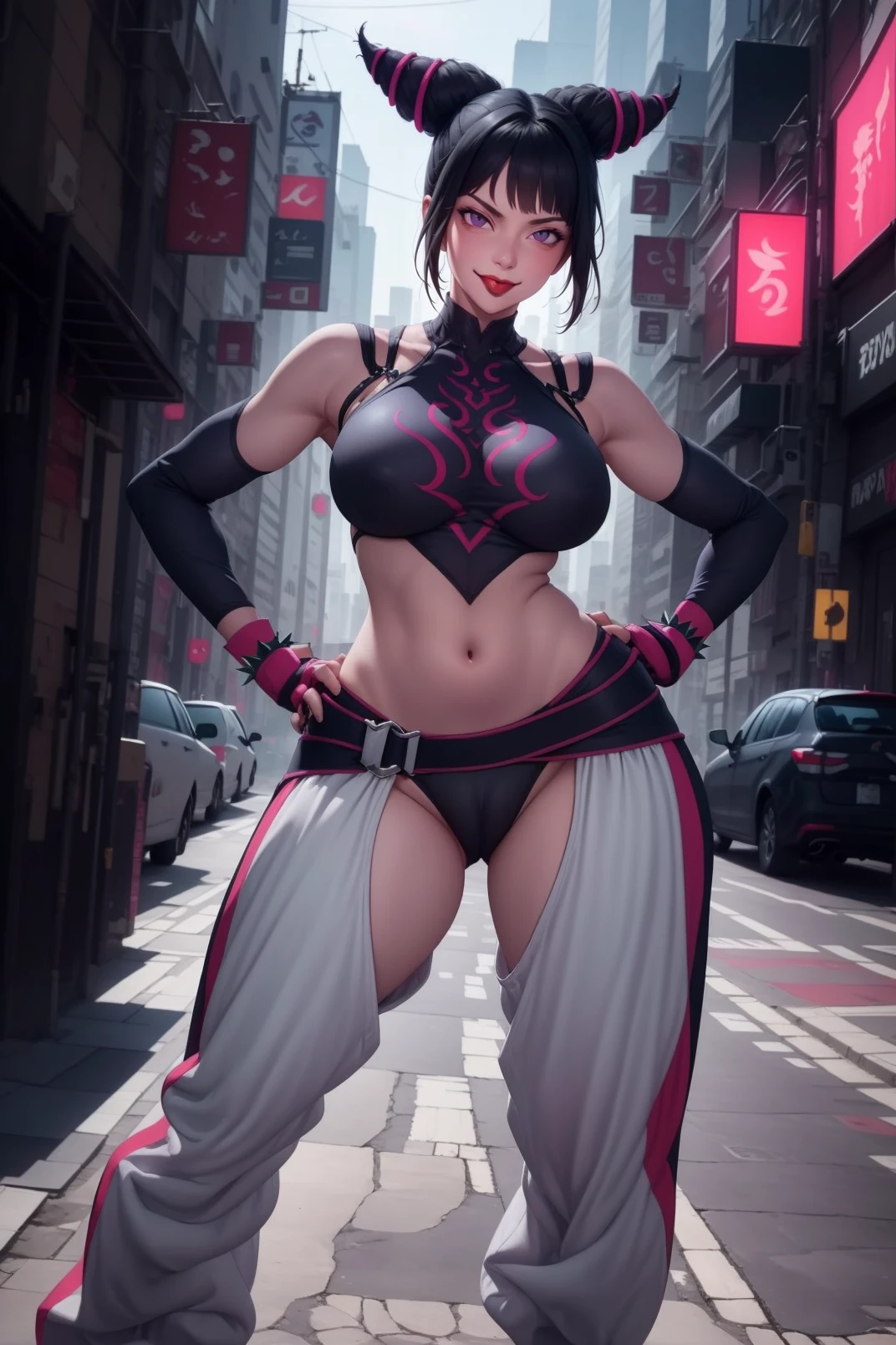 prompt: from below, best quality, masterpiece, ultra-detailed, baggy pants, torn pants, revealing clothes, han juri, blunt bangs, bangs, hair horns, dudou, barefoot, evil smile, leotard, cone hair bun, ???????, breasts, gloves, halterneck, 1girl, fingerless gloves, solo focus, underwear, navel, spiked bracelet, bracelet, black hair, jewelry, panties, black panties, belt, smile, toes, spikes, breasts out