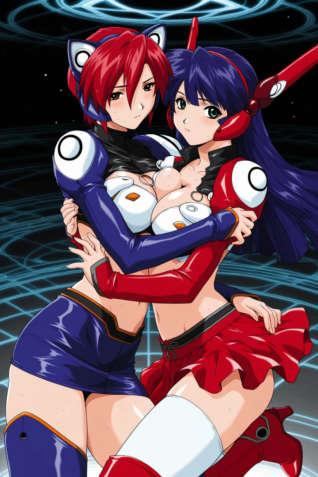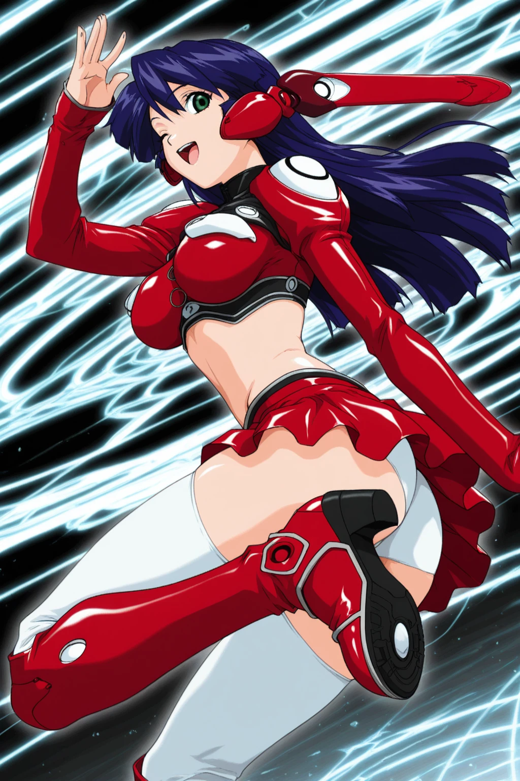 izyi yumeten a&m,anime screencap,mimi,1girl,solo,blue hair,long hair,green eyes,,red robot ears headphones,red top,long sleeves,midriff,zettai ryouiki,red ,white thighhighs,red high thigh boots,high heel boots,
