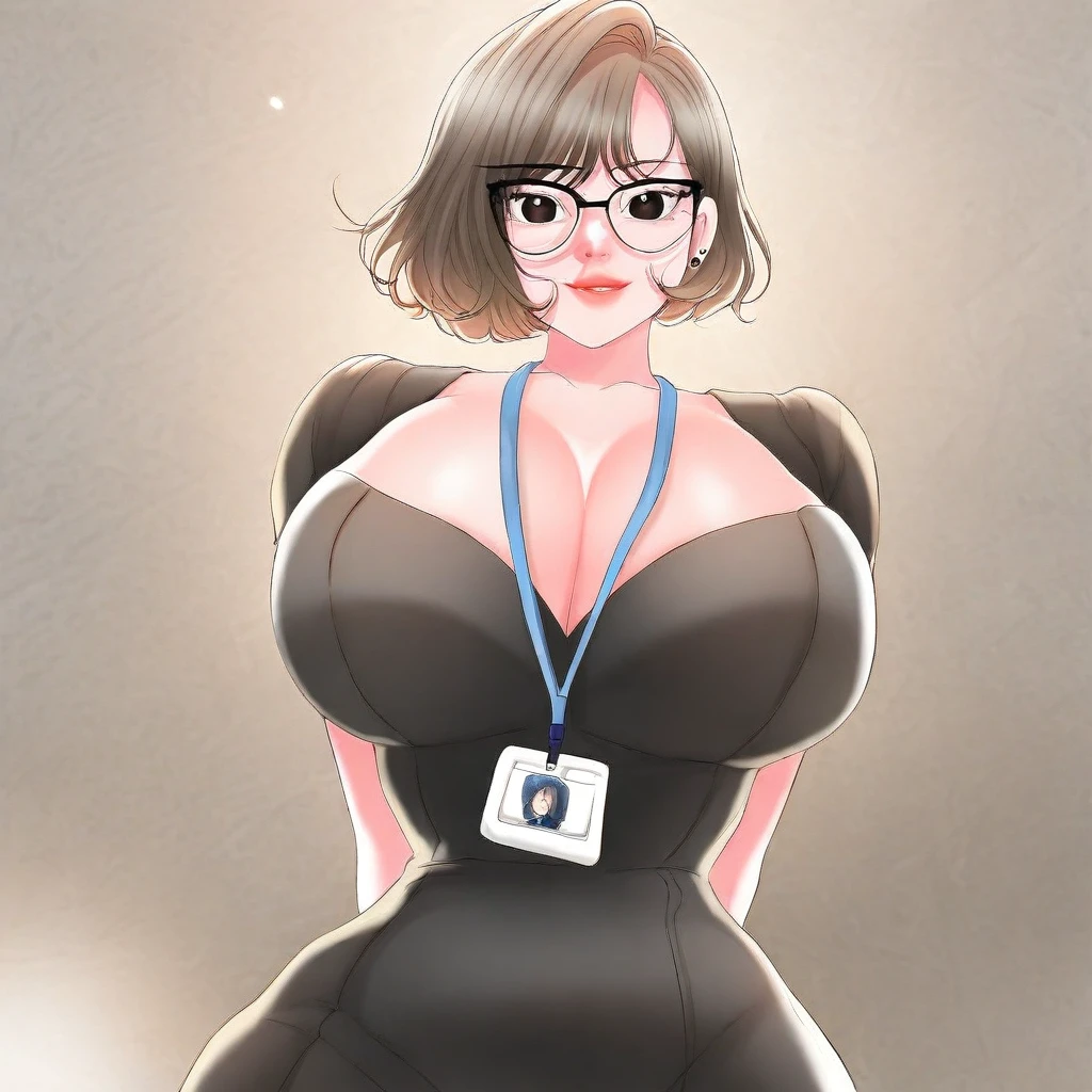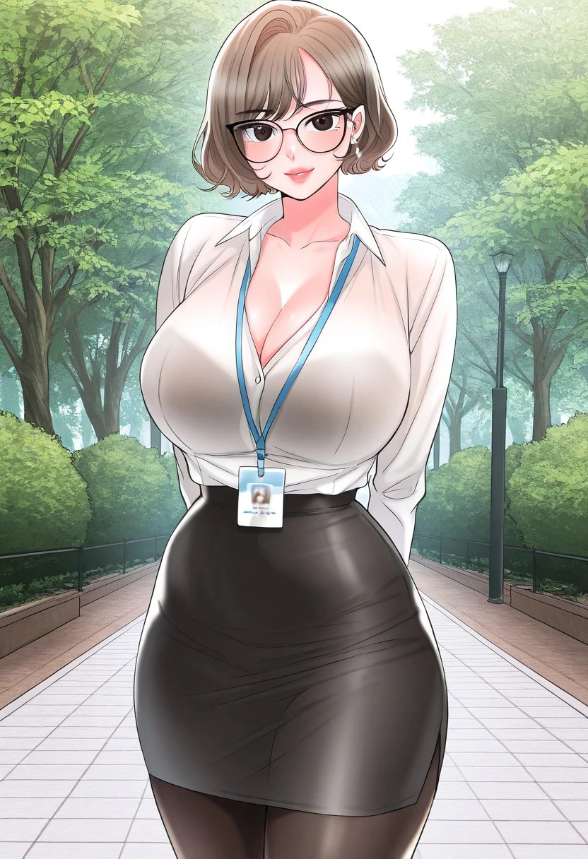 2. ((long-sleeves white shirt, obscene cleavage, huge cleavage, short black pencil skirt, black pantyhose, glasses with black frame, blue id card holder with blue lanyard, earrings, ))