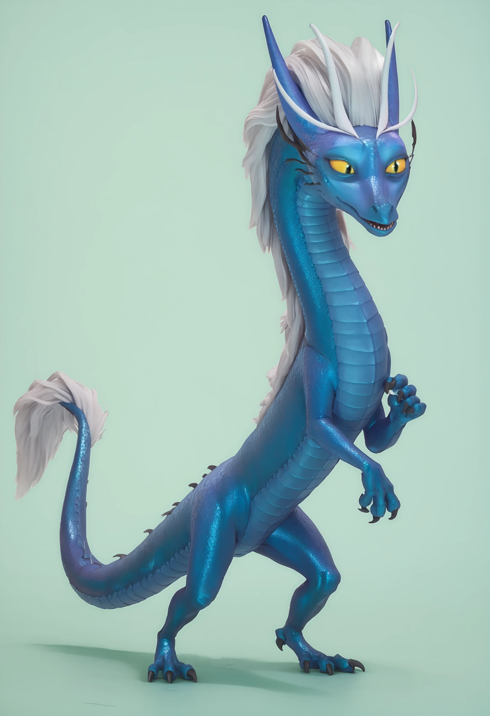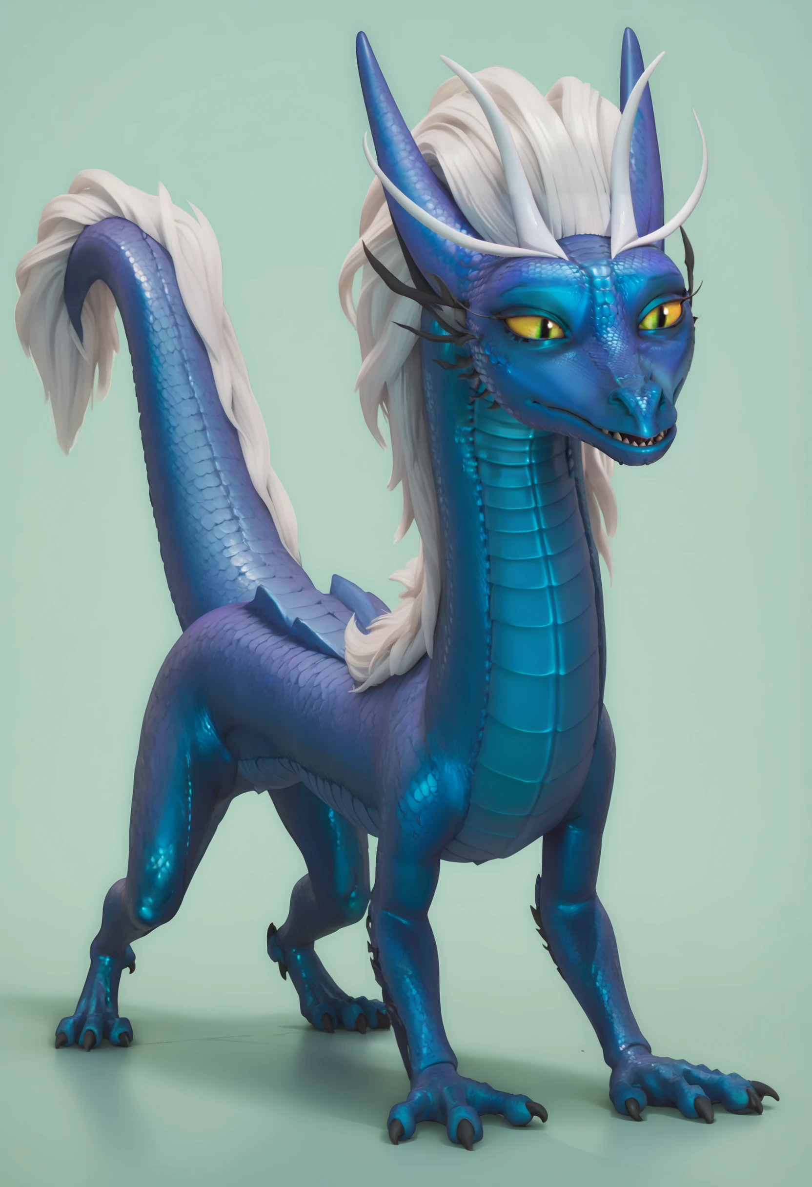 no humans, dragon, scales, colored skin, blue skin, yellow sclera, colored sclera, yellow eyes, slit pupils, horns, claws, white hair, tail