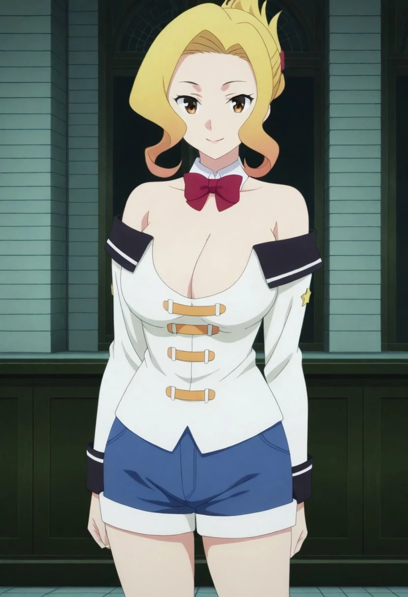 bare shoulders, red bowtie, cleavage, detached collar, off-shoulder shirt, white shirt, blue shorts,