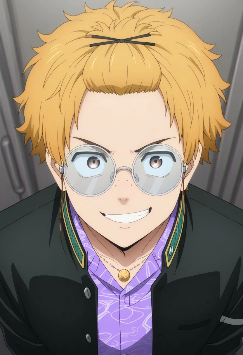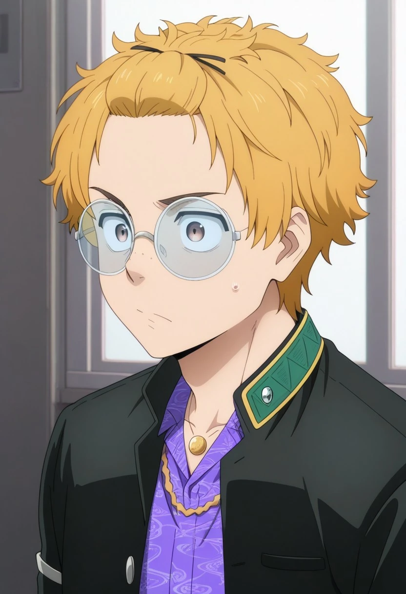 AkihikoNirei, 1boy, male focus, solo, brown eyes, blonde hair, bangs pinned back, freckles, glasses, round eyewear, school uniform, necklace, jacket, black jacket, open jacket, shirt, purple shirt, collared shirt,