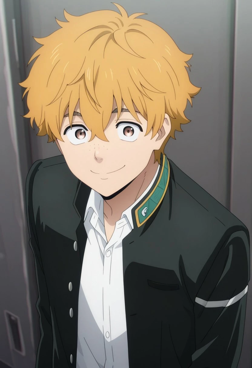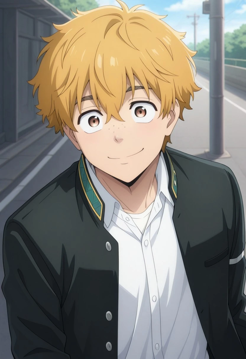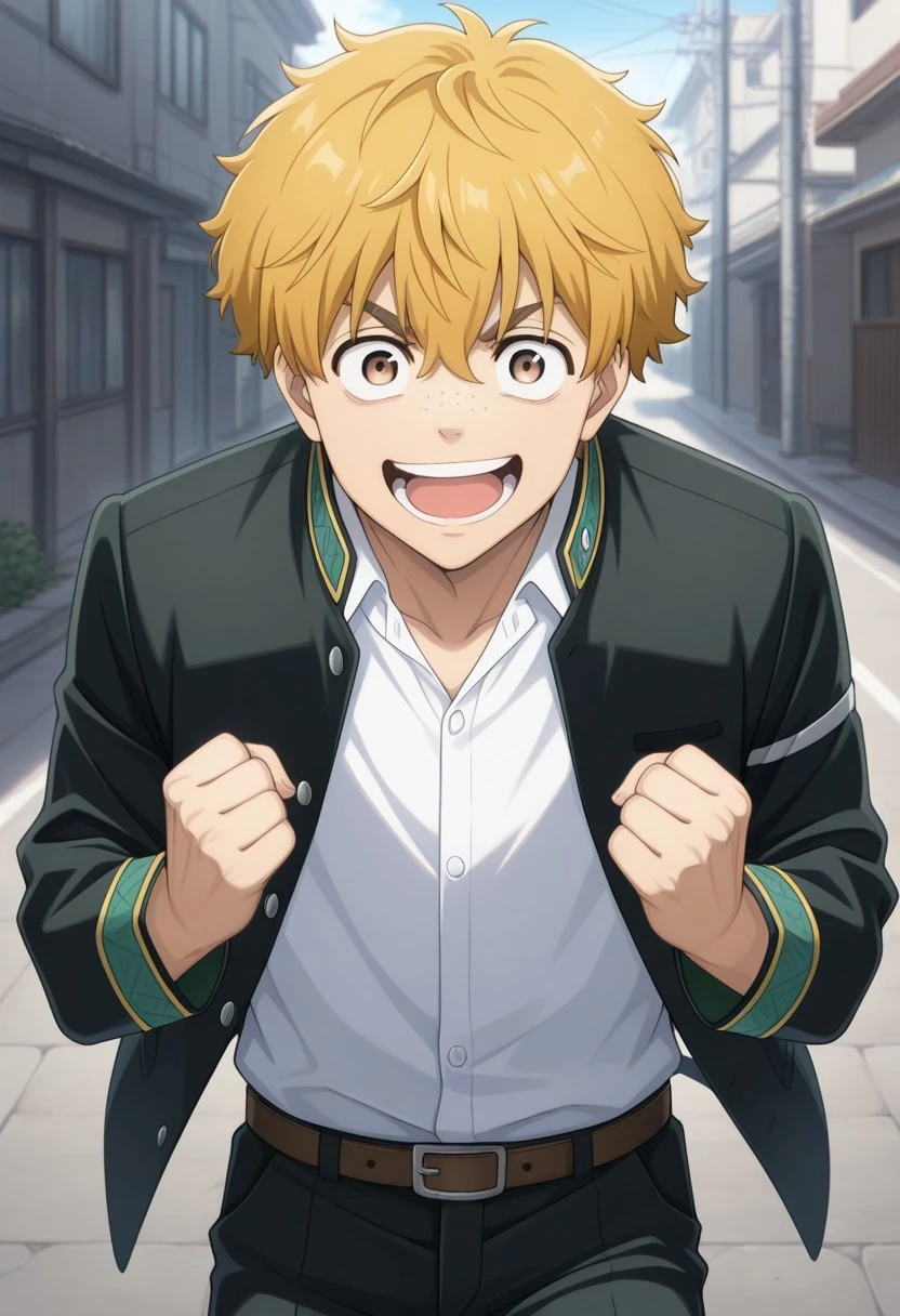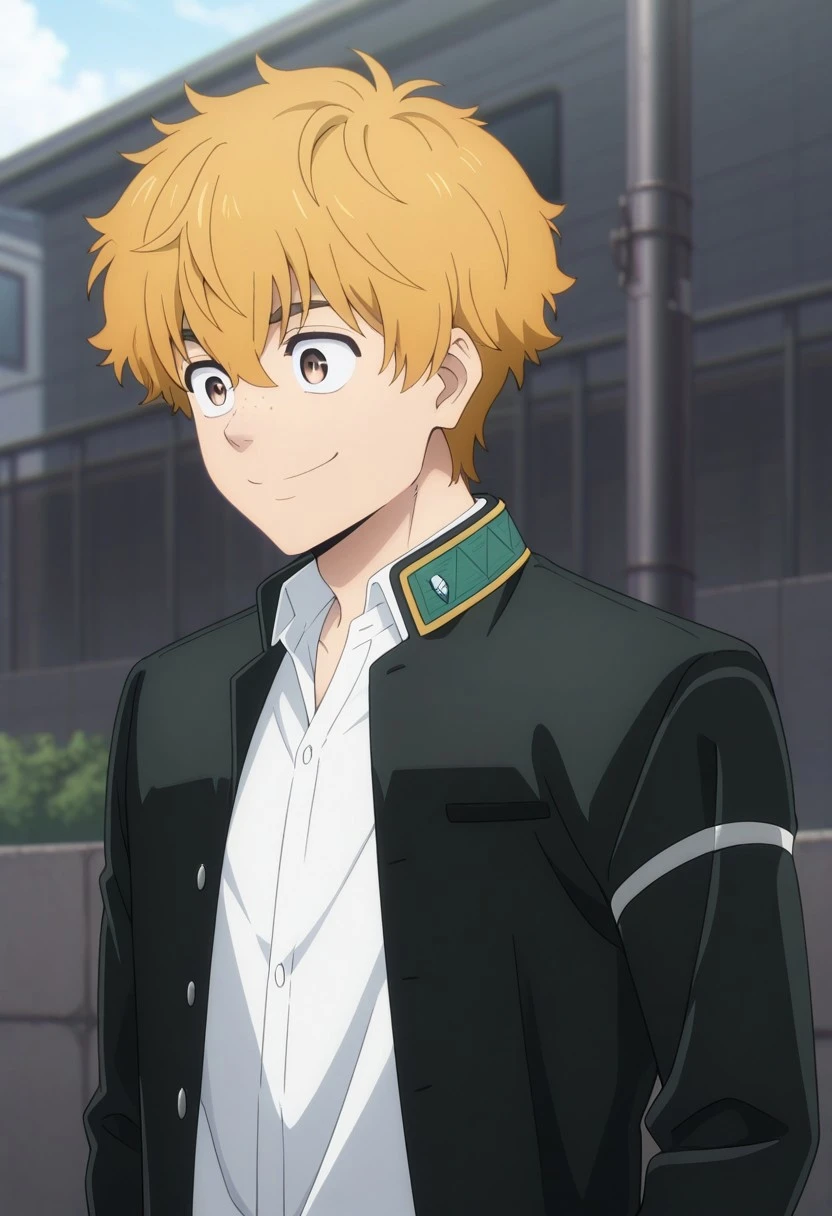AkihikoNirei, 1boy, male focus, solo, brown eyes, blonde hair, freckles, school uniform, jacket, black jacket, open jacket, shirt, white shirt, collared shirt, belt, pants, black pants, shoes, sneakers, black footwear,