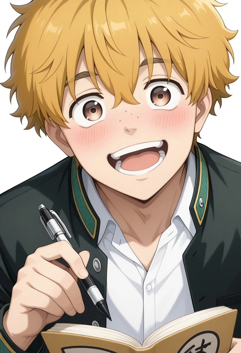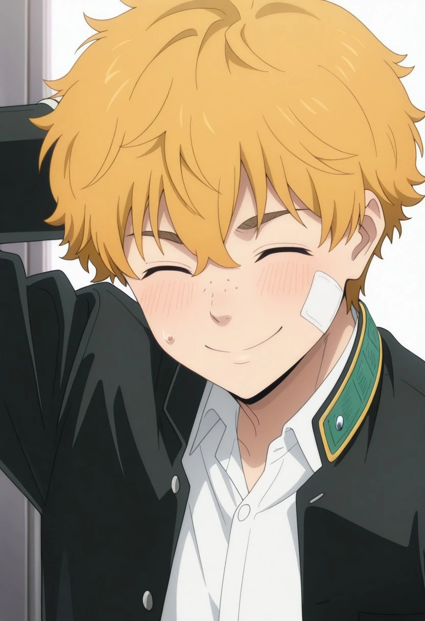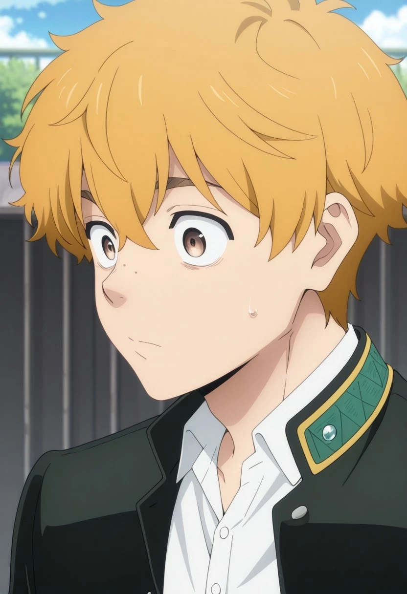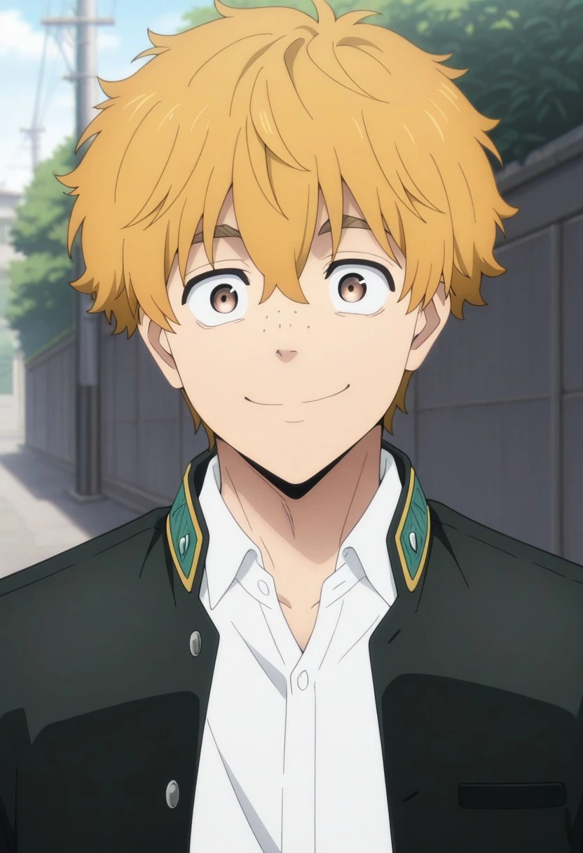 AkihikoNirei, 1boy, male focus, solo, brown eyes, blonde hair, freckles, school uniform, jacket, black jacket, open jacket, shirt, white shirt, collared shirt, belt, pants, black pants, shoes, sneakers, black footwear,