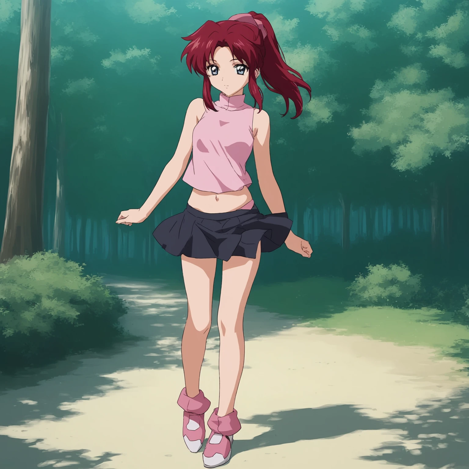 2 - socre_9, score_8_up, score_7_up, (masterpiece, best quality:1.4), 1girl, 20yo, flay allster, solo, source_anime \(gundam seed\), dark red hair, blue grey eyes, ponytail, white pink sleeveless shirt, knot in the side, black short skirt, navel, pink shoes, stands up, forest,