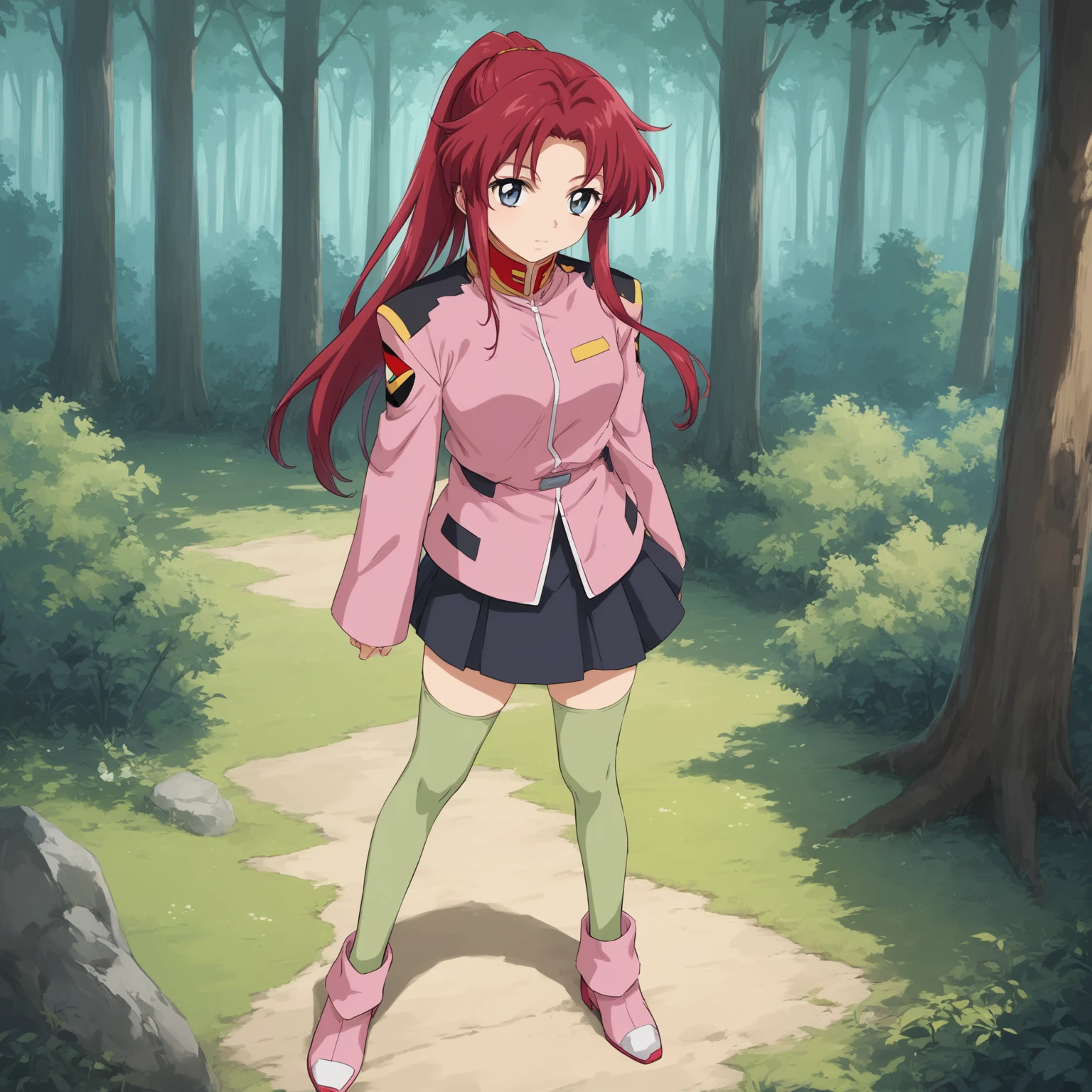1- socre_9, score_8_up, score_7_up, (masterpiece, best quality:1.4), 1girl, flay allster, \(gundam seed\), red hair, blue grey eyes, ponytail, pink short military jacket, black skirt, green, thighhighs, pink shoes, stands up, forest,