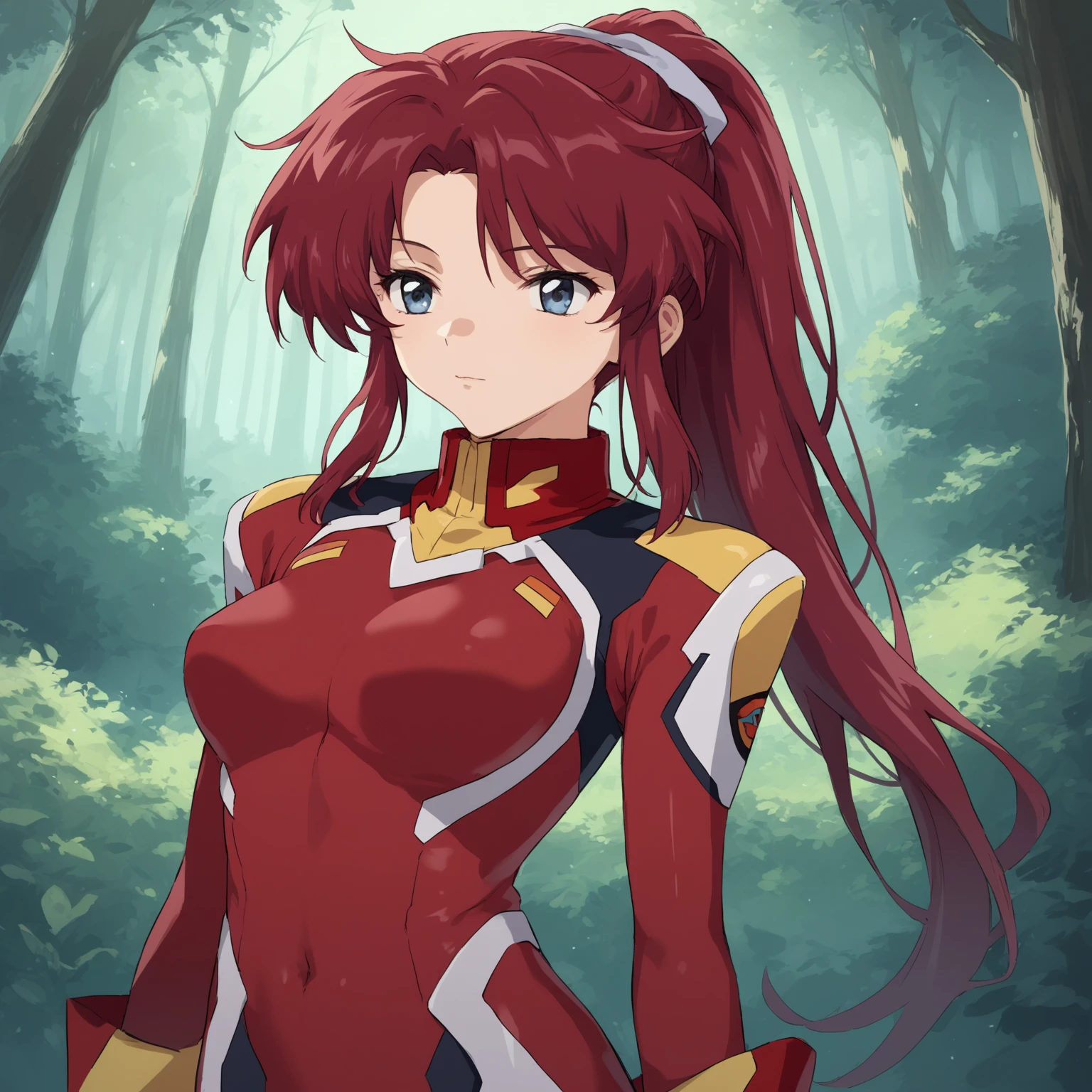 3 - socre_9, score_8_up, score_7_up, (masterpiece, best quality:1.4), 1girl, 20yo, flay allster, solo, source_anime \(gundam seed\), dark red hair, blue grey eyes, ponytail, red pilot suit, stands up, forest,