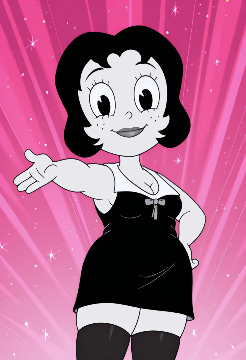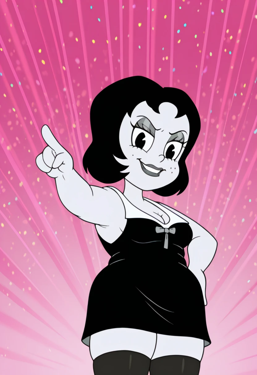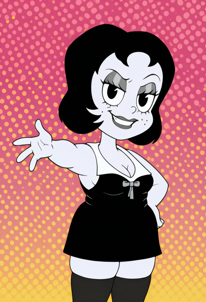 t00t8r4, 1girl, black hair, two-tone dress, black thighhighs, black high heels