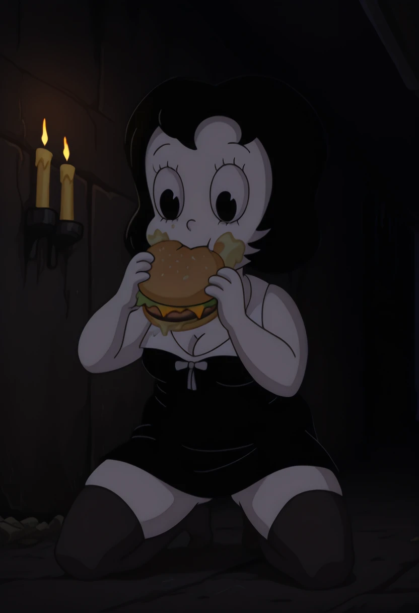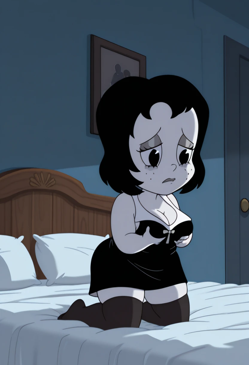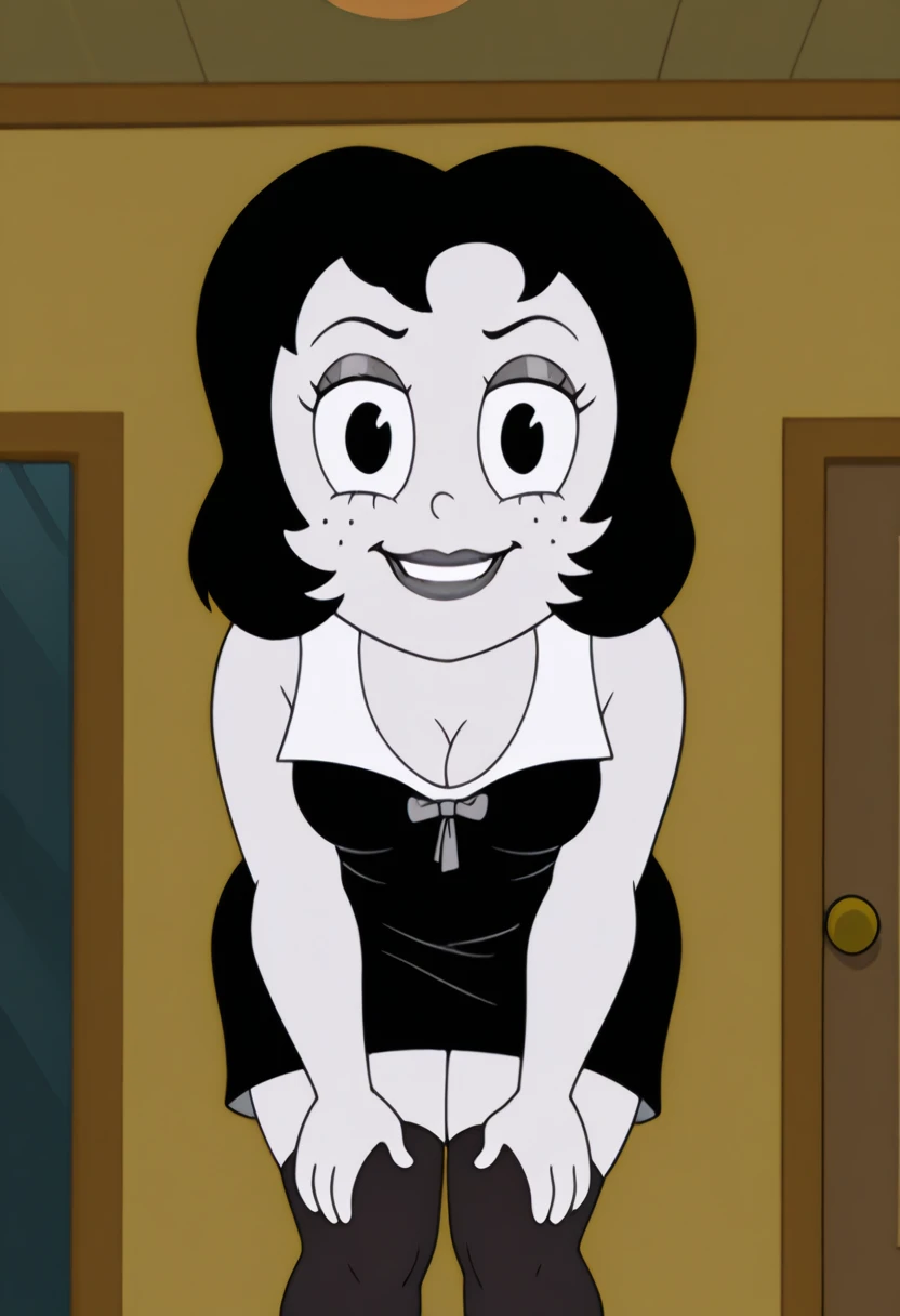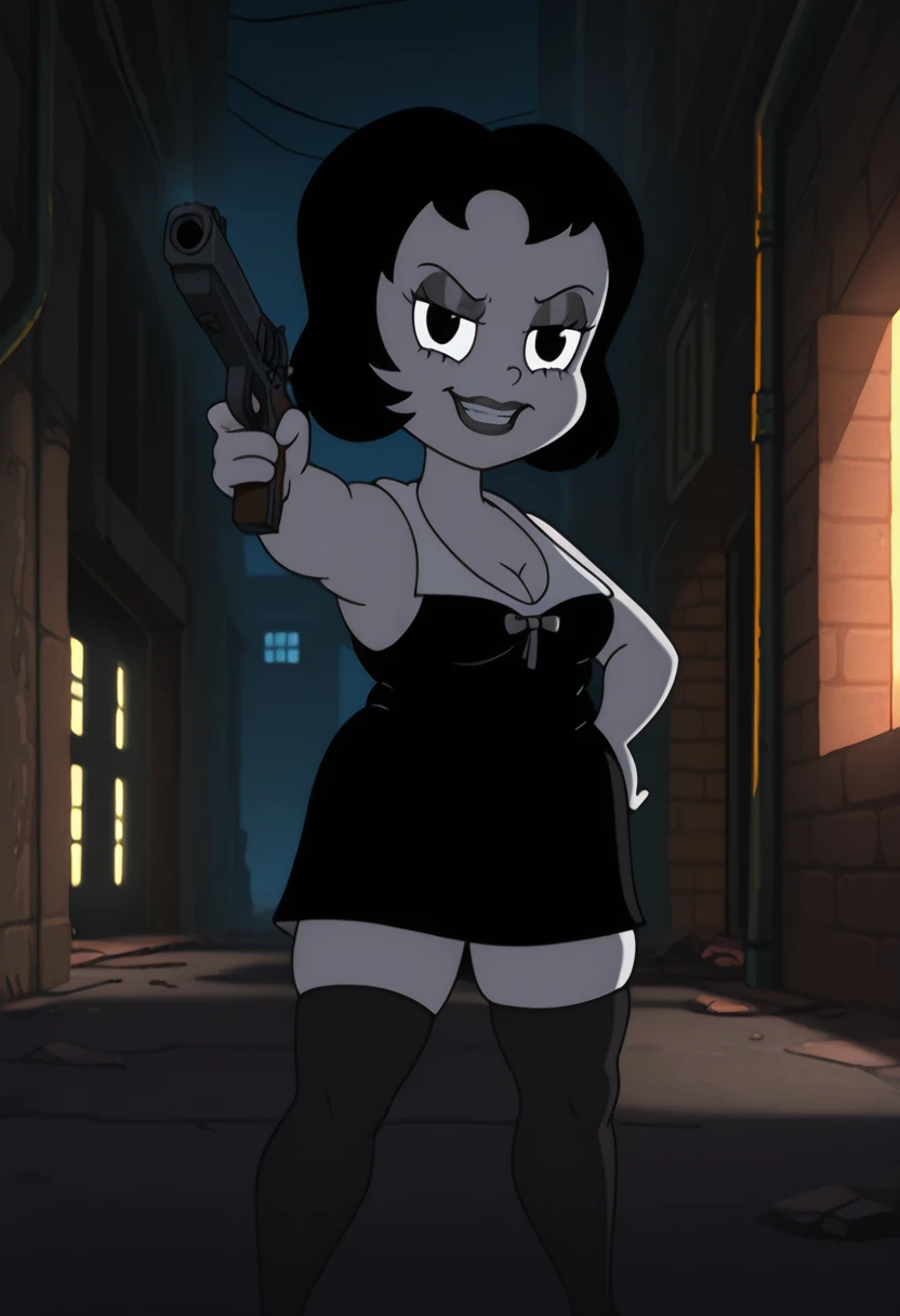 t00t8r4, 1girl, black hair, two-tone dress, black thighhighs, black high heels