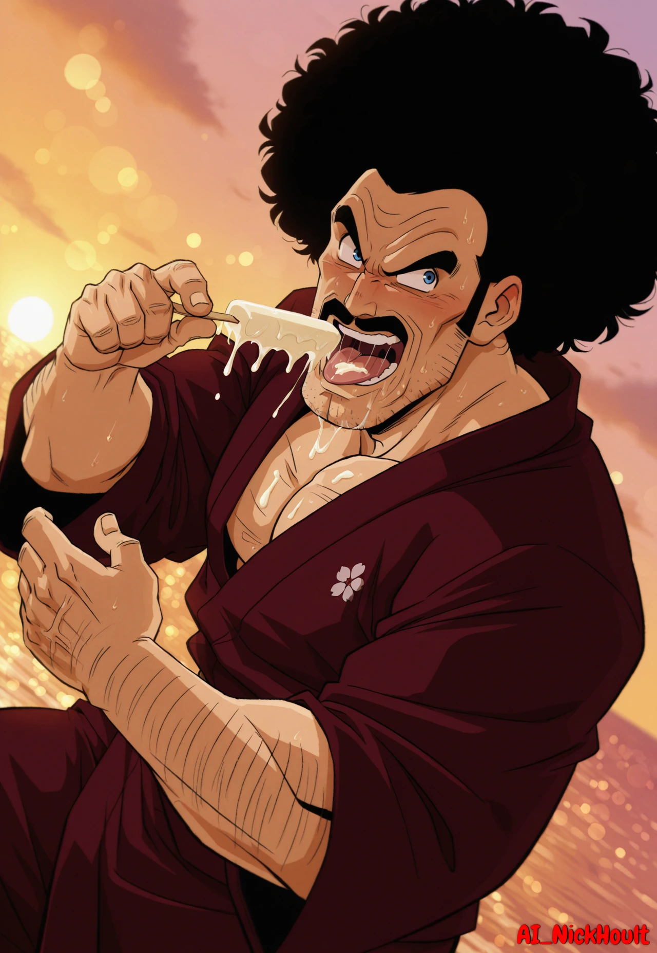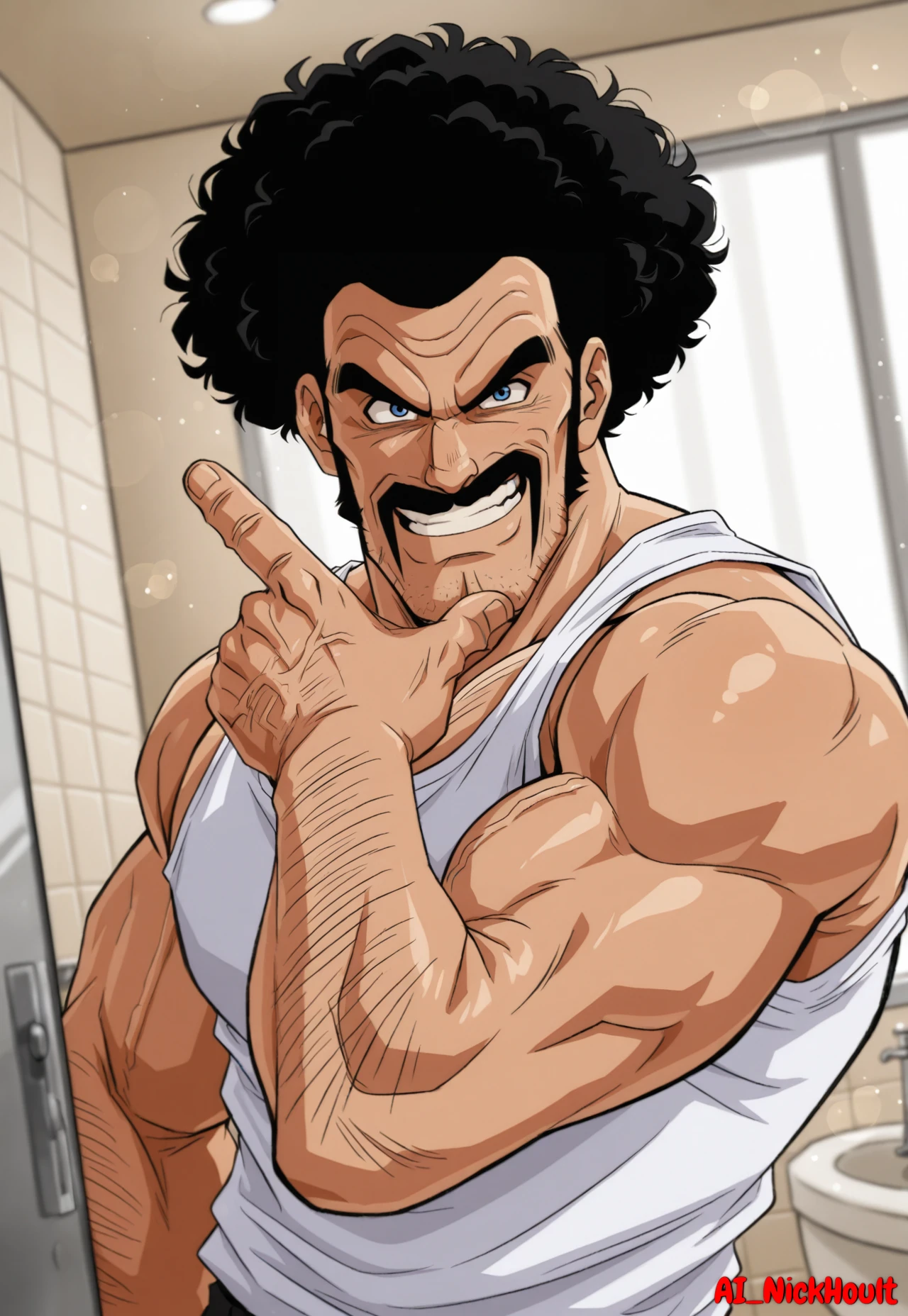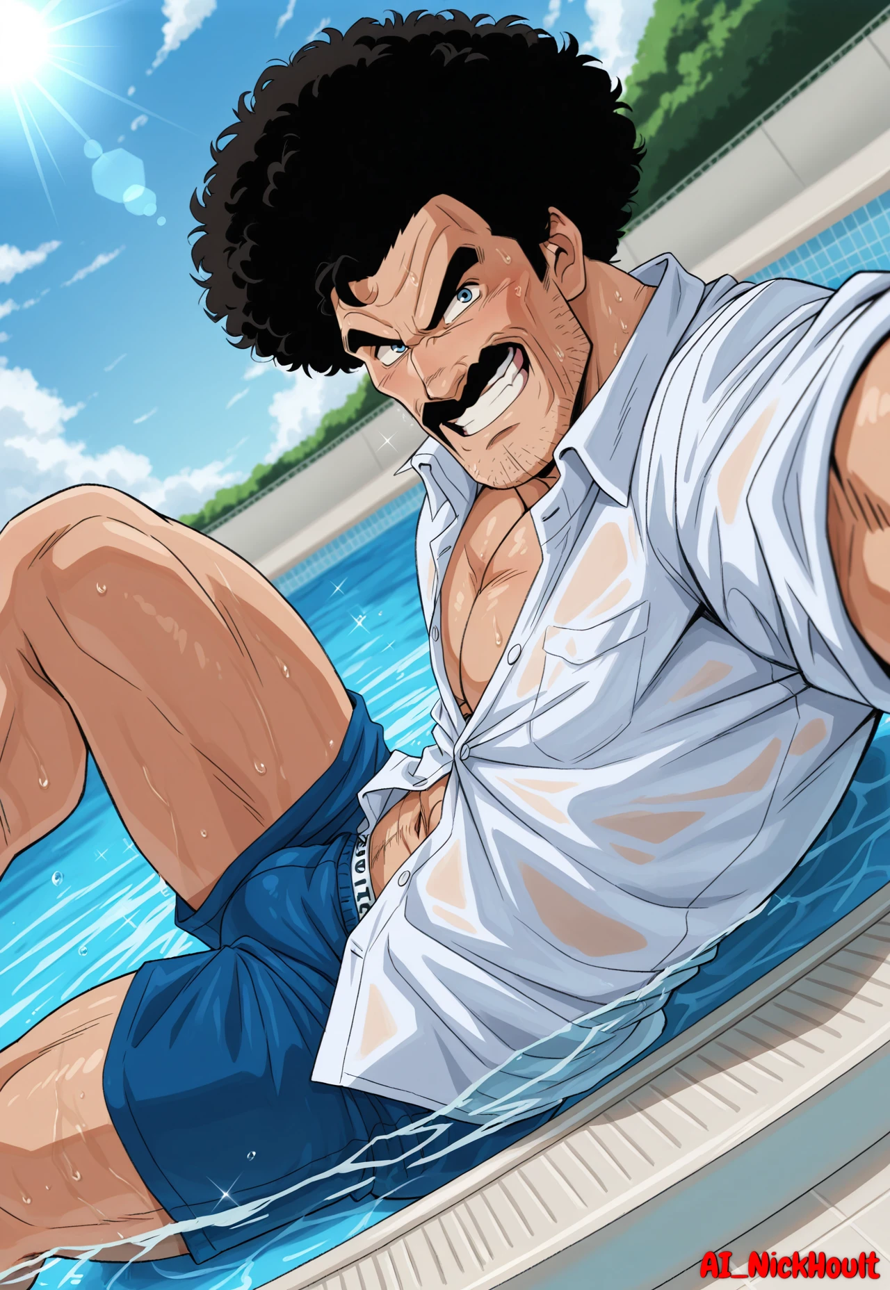 MrSat, mature man, muscular man, large black curly hair, bushy black mustache, blue eyes, stubble,