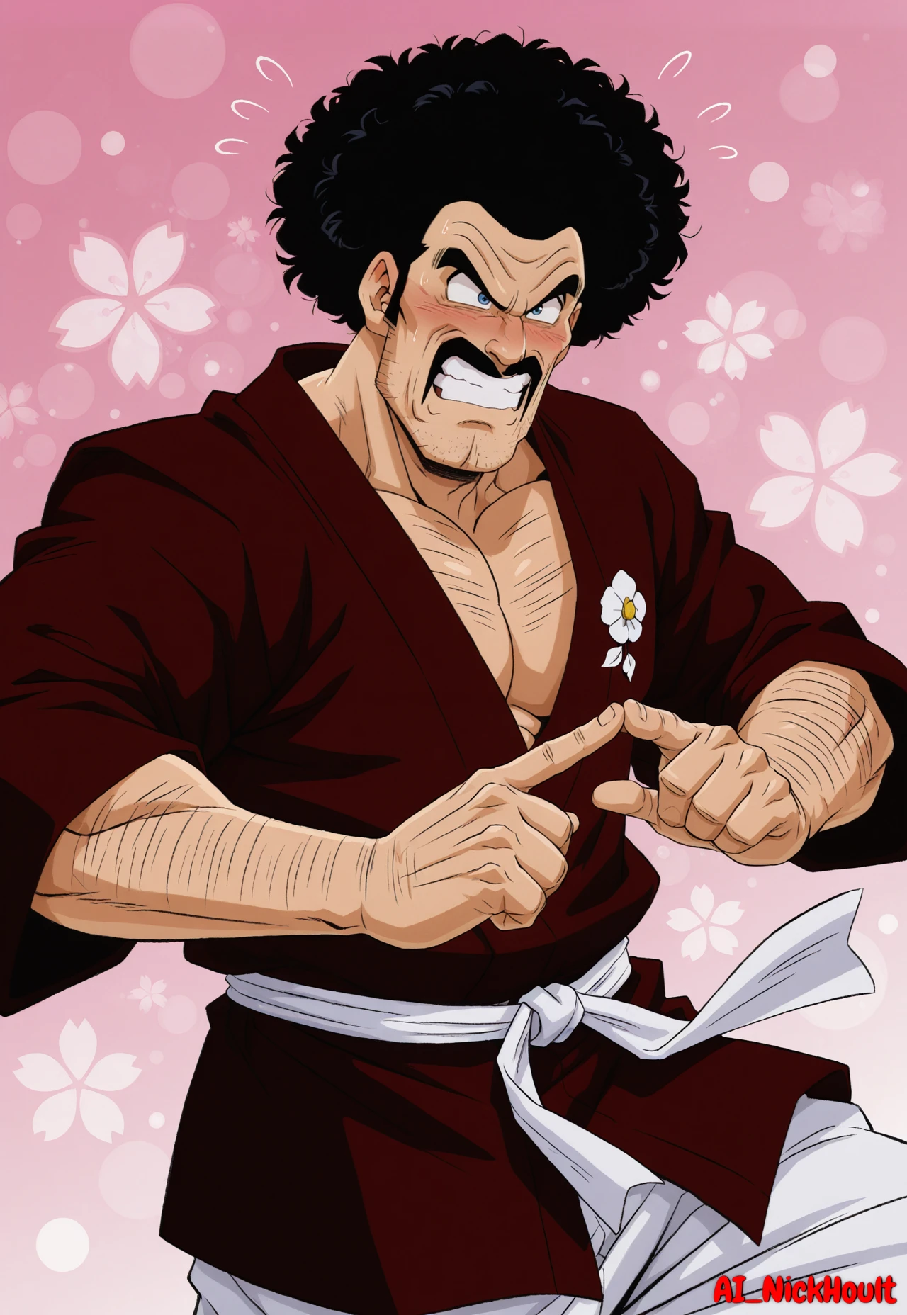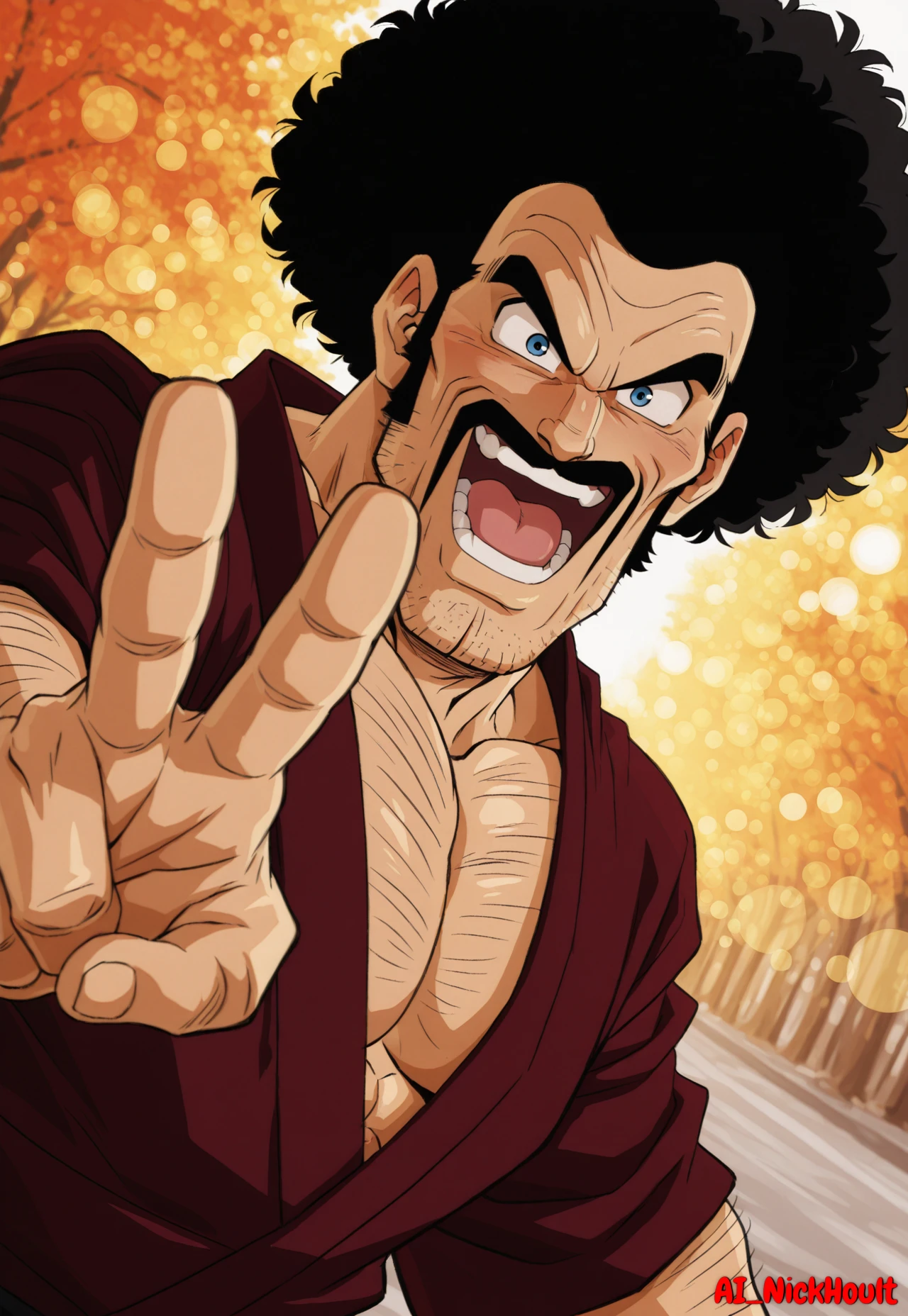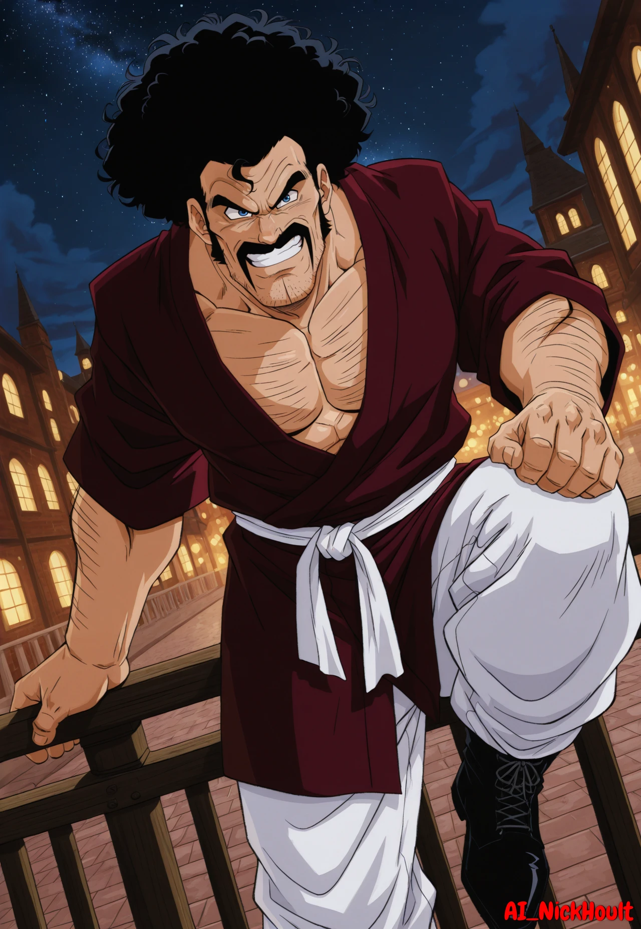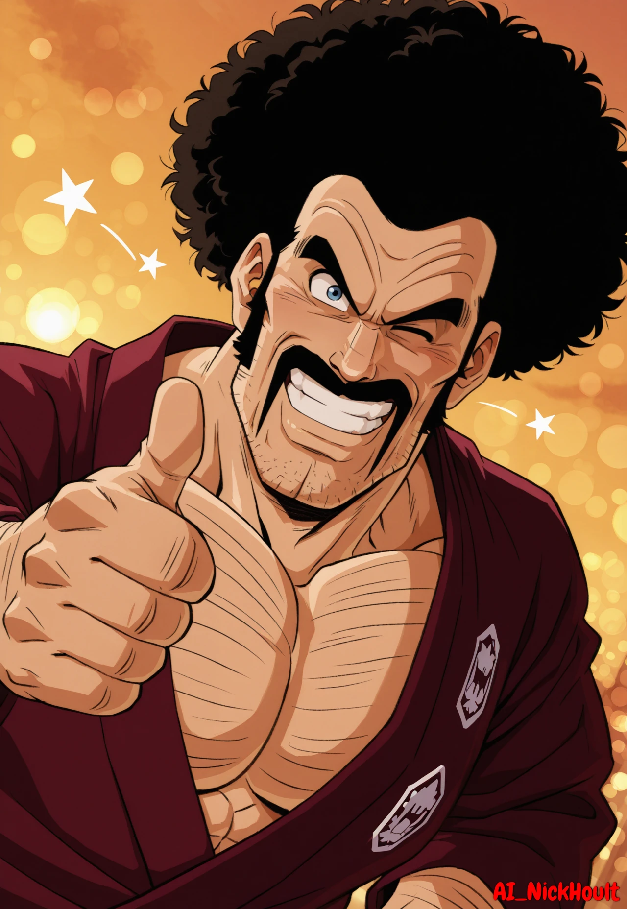 MrSat, mature man, muscular man, large black curly hair, bushy black mustache, blue eyes, stubble,