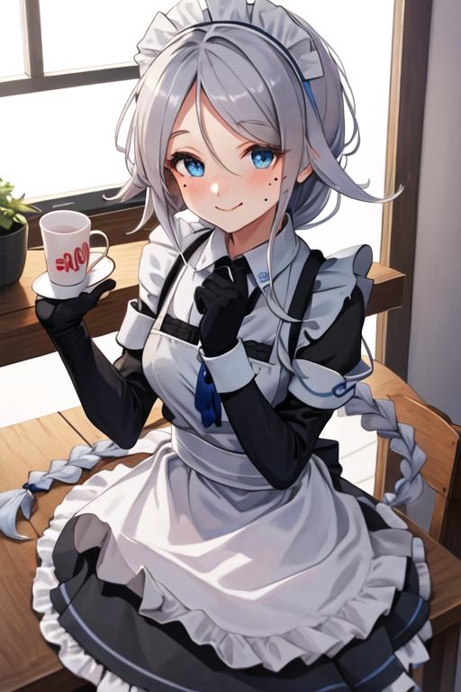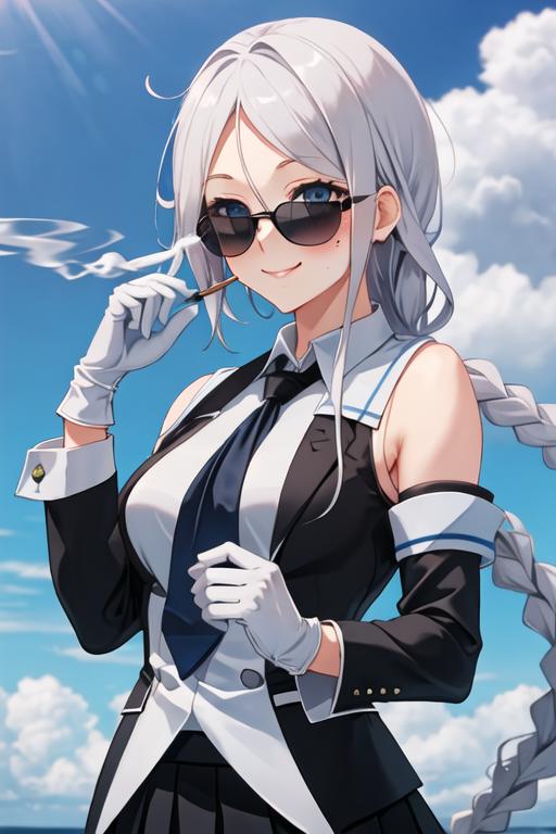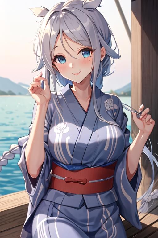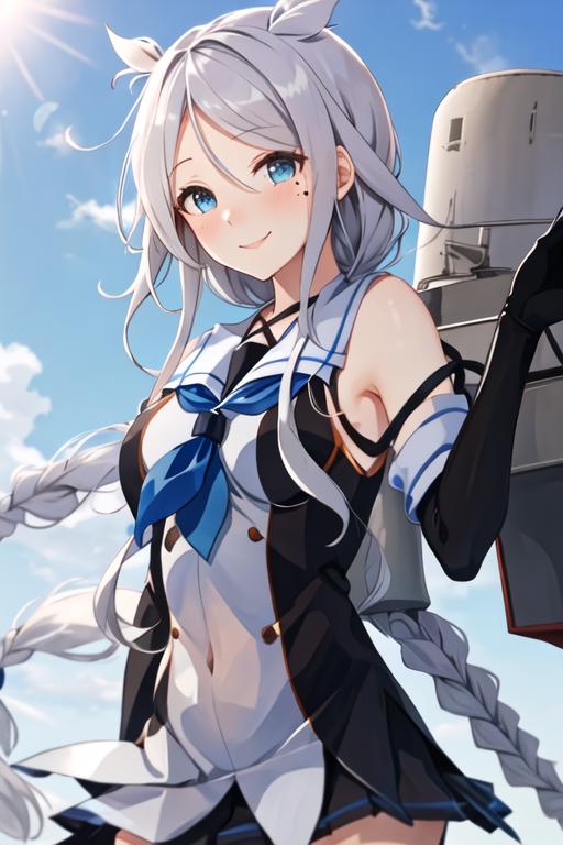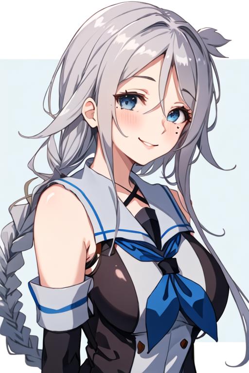 The trigger word is umikaze_kantaicollection, and the recommended tags are best quality, masterpiece, highres, solo, {umikaze_kantaicollection:1.15}, long_hair, blue_eyes, braid, single_braid, grey_hair, bangs, mole, mole_under_eye, very_long_hair, parted_bangs, breasts, blush, serafuku, sleeveless, smile, white_hair, hair_tie, hair_flaps.