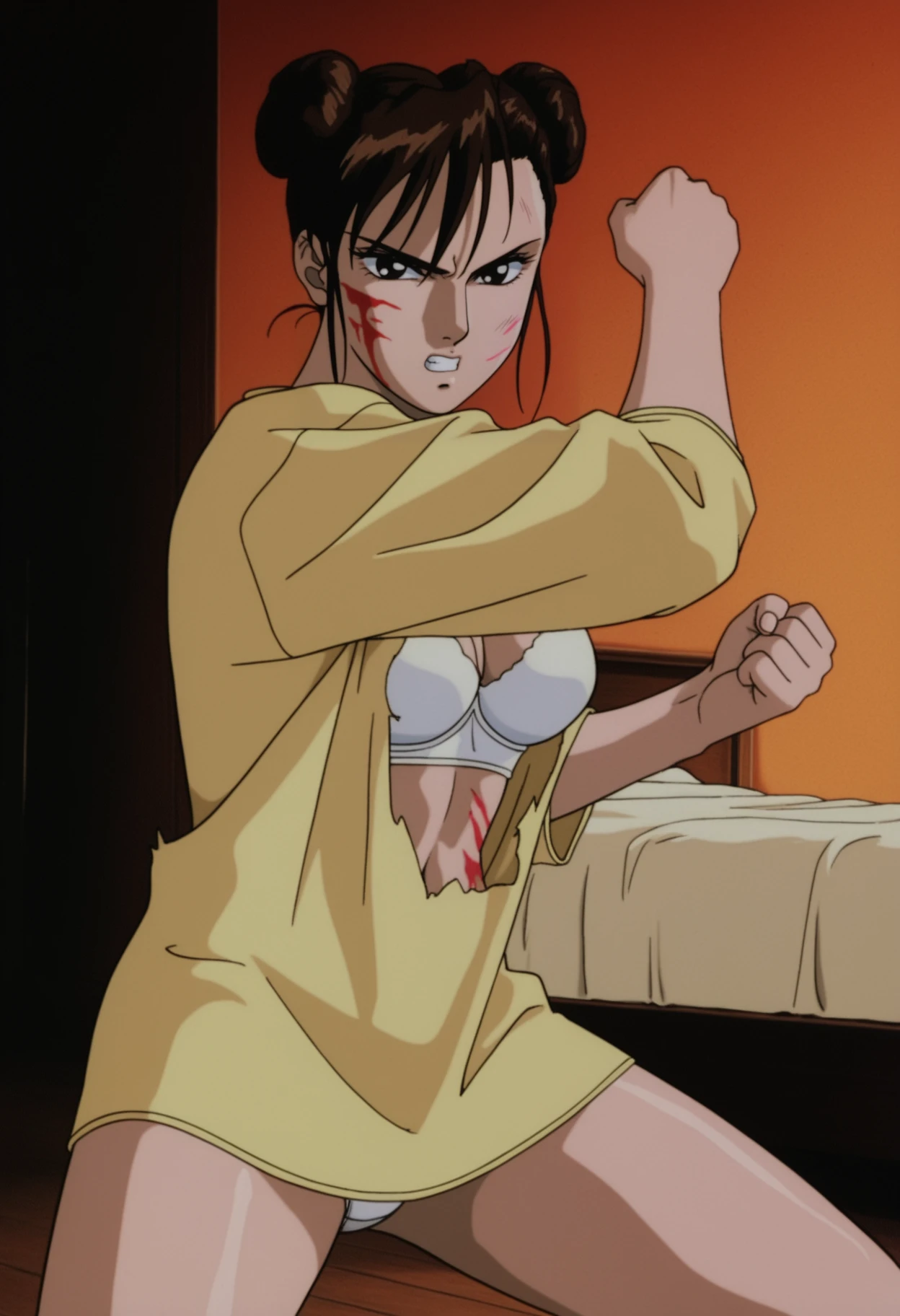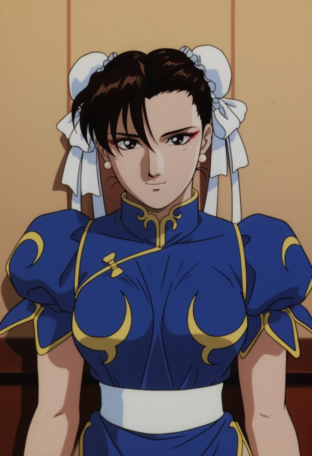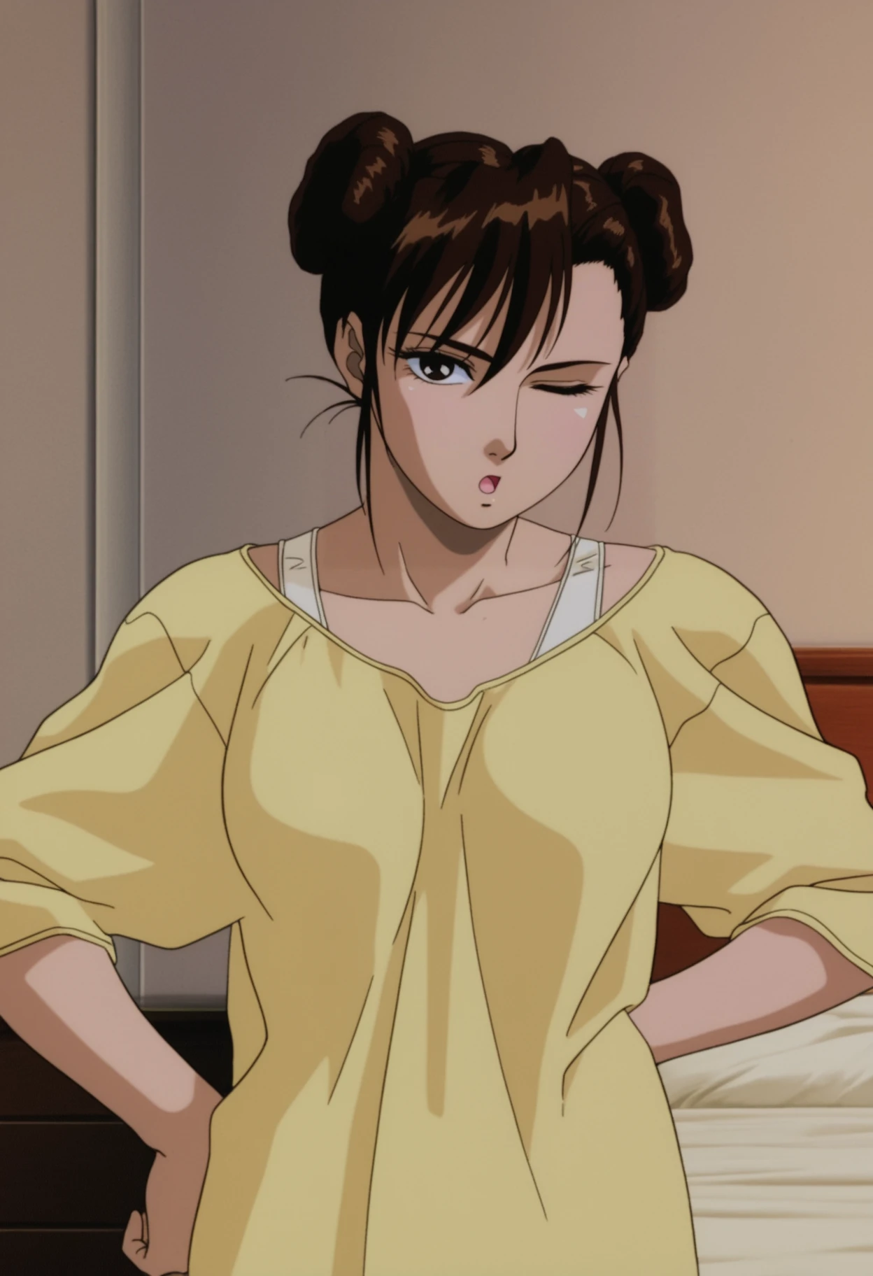 1girl,solo,anime coloring,mm,double bun,hair bun,brown hair,brown eyes,,retro artstyle,1990s (style)