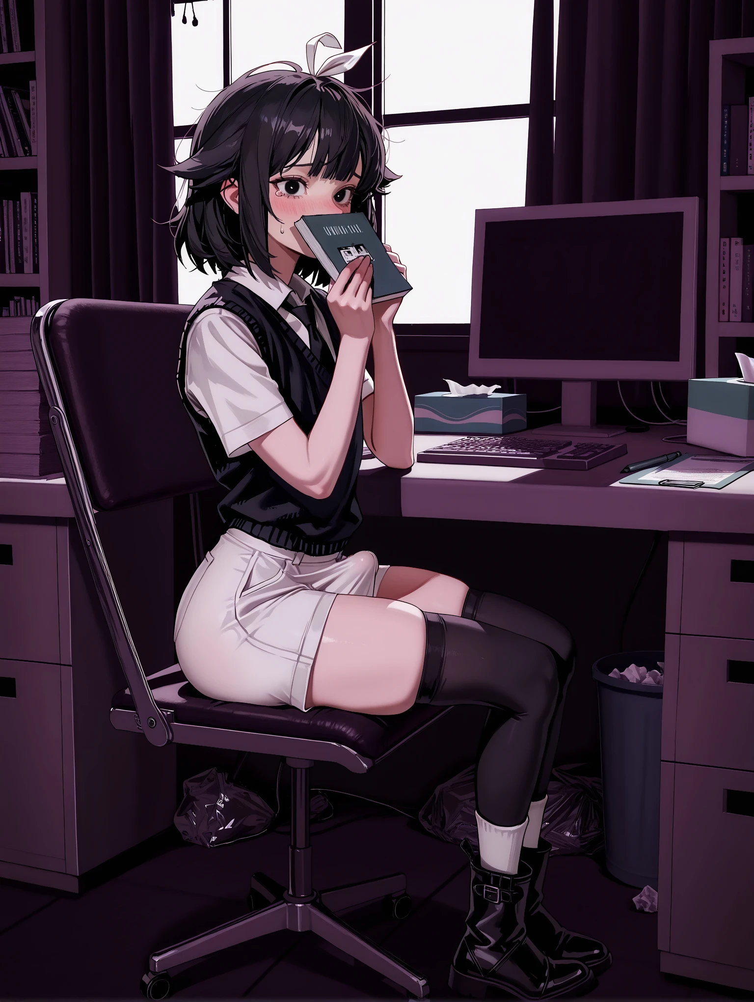 Outfit Prompt : shirt, short sleeves, collared shirt, shorts, white ribbon, sweater vest, white shirt, white shorts, black necktie, black footwear, white socks
