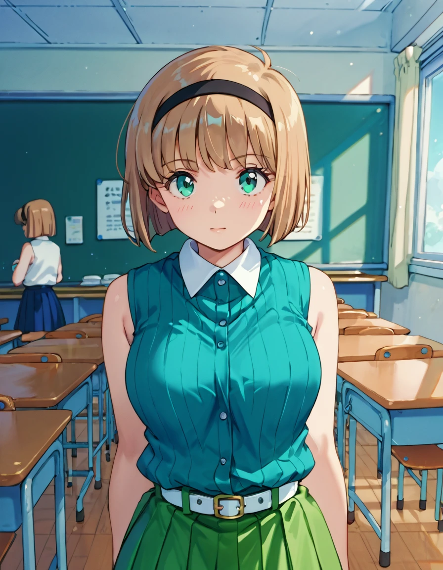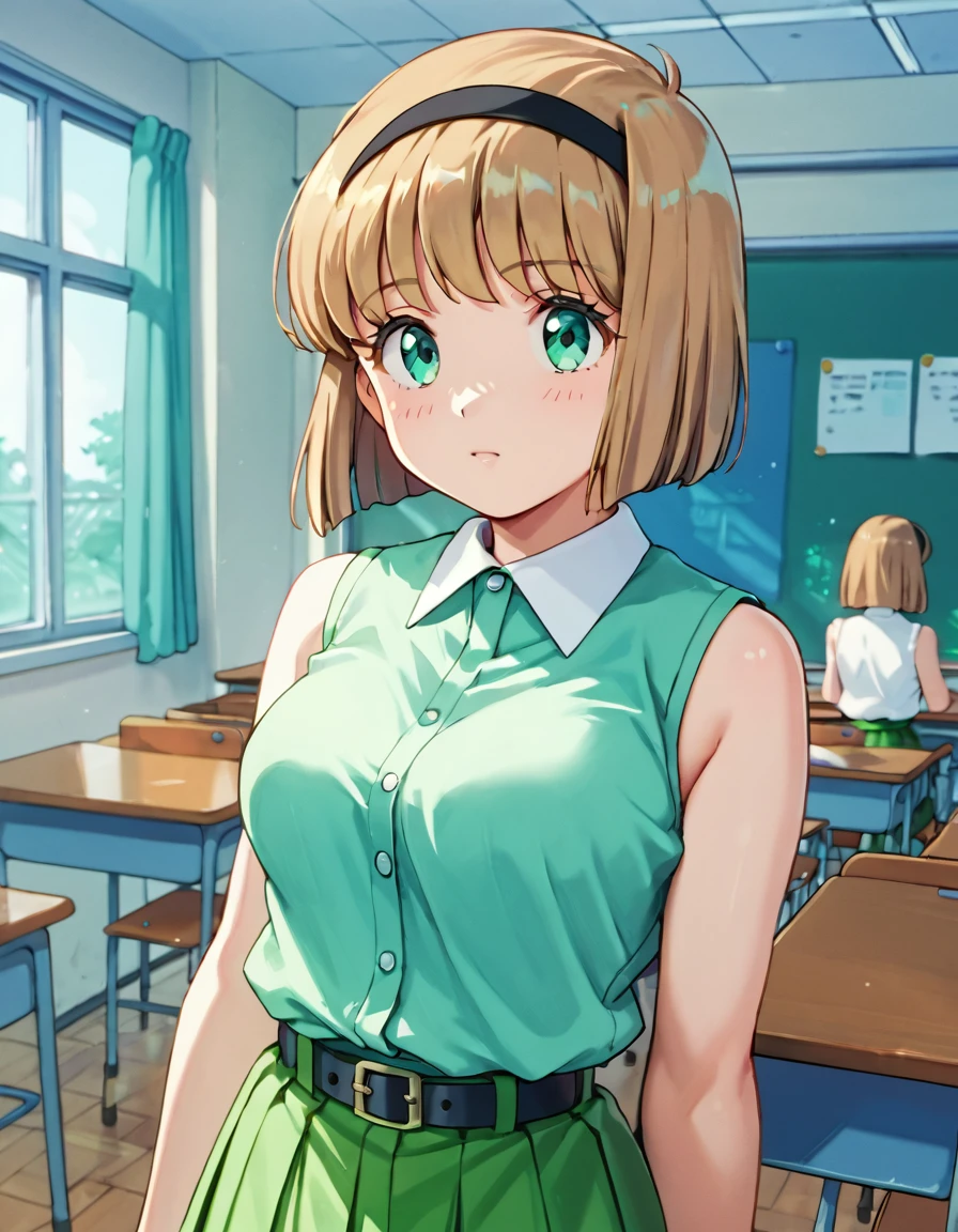 score_9, score_8_up, score_7_up, source_anime, <lora:Miki_Hosokawa_Pony_-_Jigoku_Sensei_Nube_-_90s:1> Miki Hosokawa, Miki, brown hair, green eyes, black hairband, hairband, bob cut, short hair, 1990s \(style\), retro artstyle, classroom, sleeveless, shirt, belt, sleeveless shirt, skirt