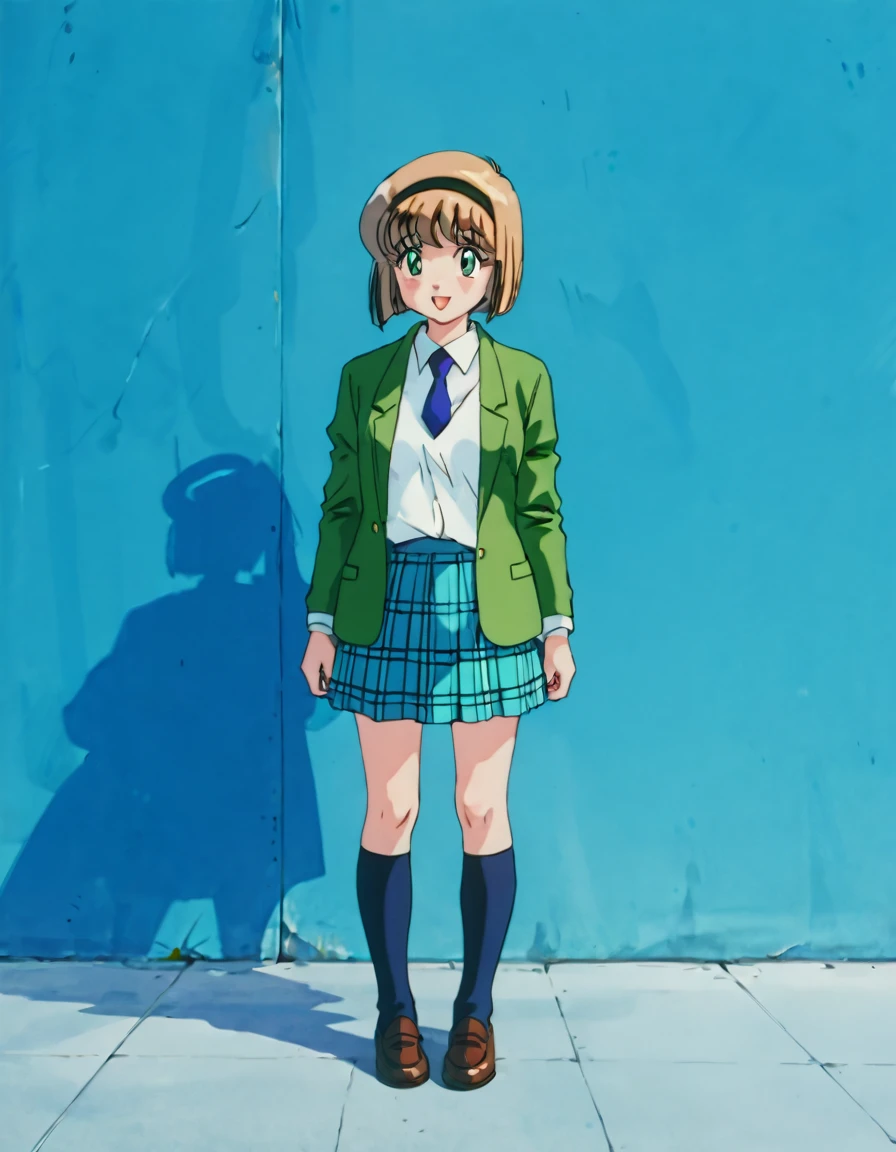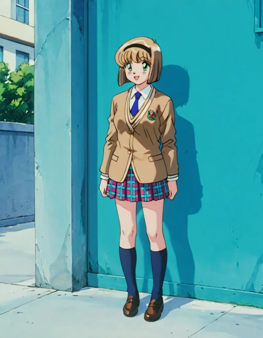 score_9, score_8_up, score_7_up, source_anime, <lora:Miki_Hosokawa_Pony_-_Jigoku_Sensei_Nube_-_90s:1> Miki Hosokawa, Miki, brown hair, green eyes, black hairband, hairband, bob cut, short hair, 1990s \(style\), retro artstyle, school uniform, blue necktie, full body, plaid, plaid skirt, kneehighs