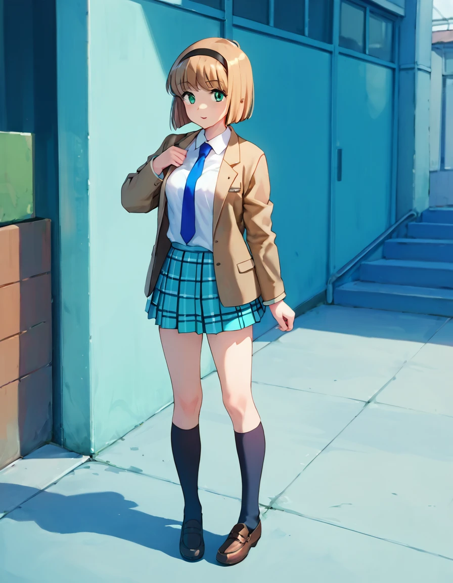 Miki Hosokawa, Miki, brown hair, green eyes, black hairband, hairband, bob cut, short hair, school uniform, blue necktie, full body, plaid, plaid skirt, kneehighs