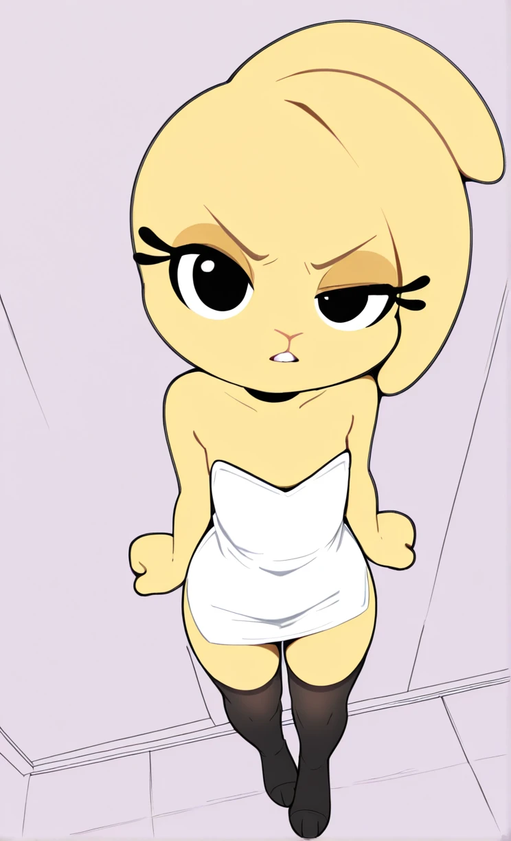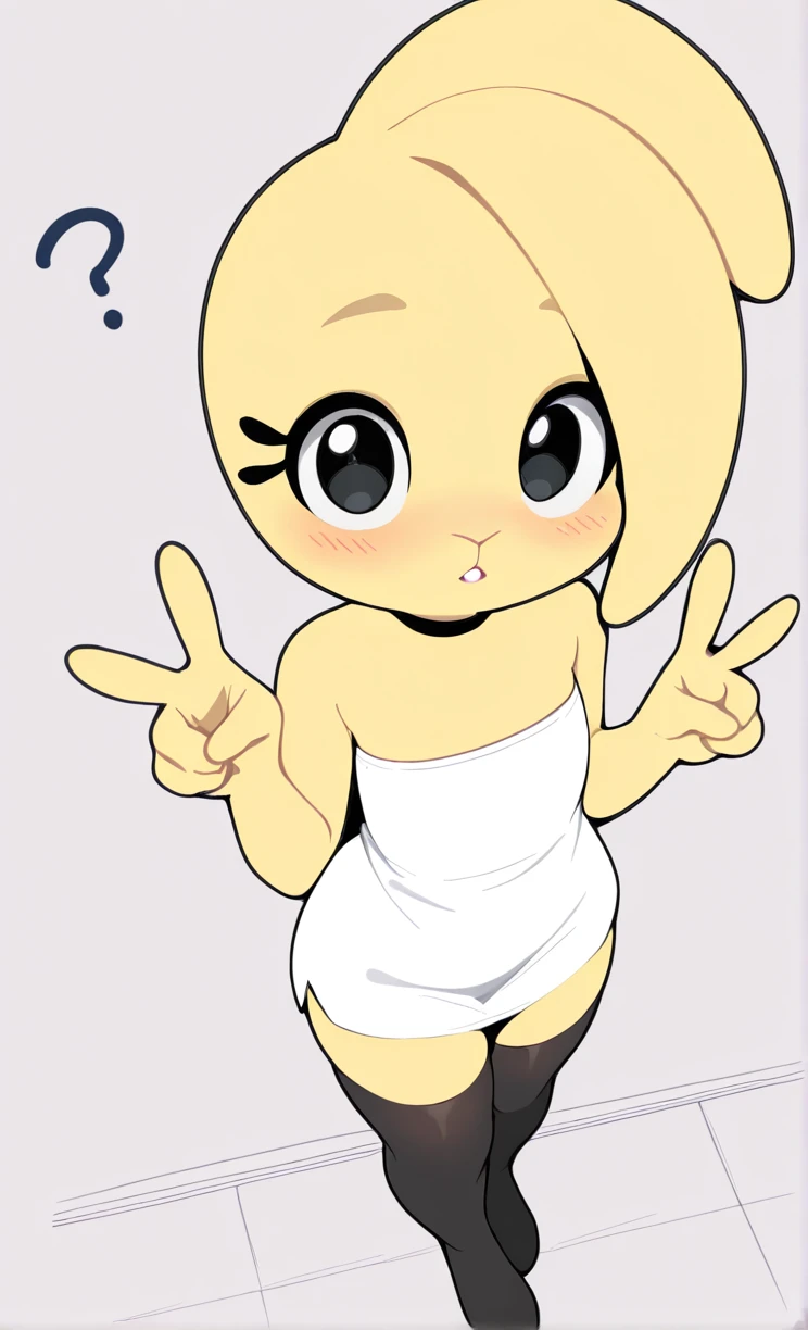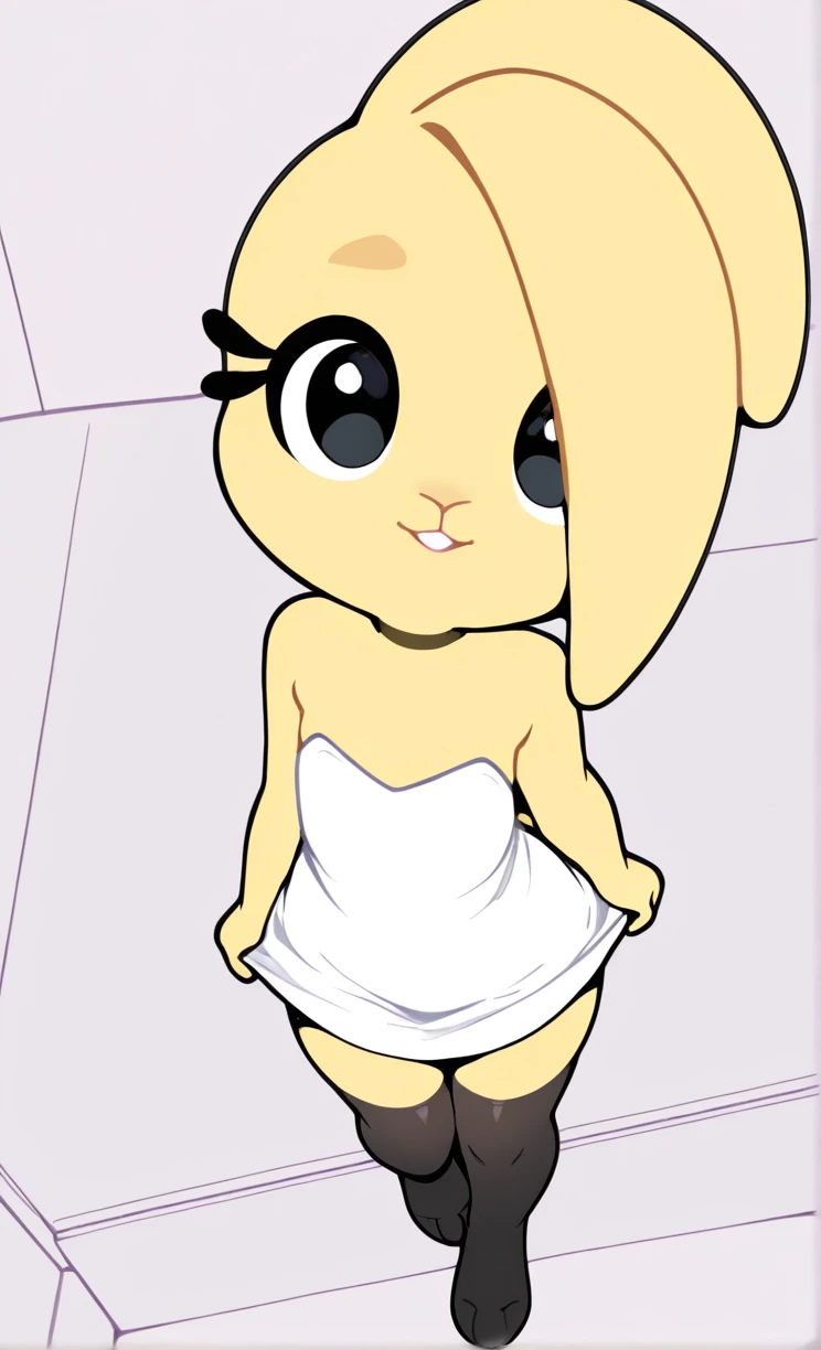 1girl, bonita, rabbit girl, furry female, black eyes, black thighhighs,yellow skin animal ears, white dress, strapless