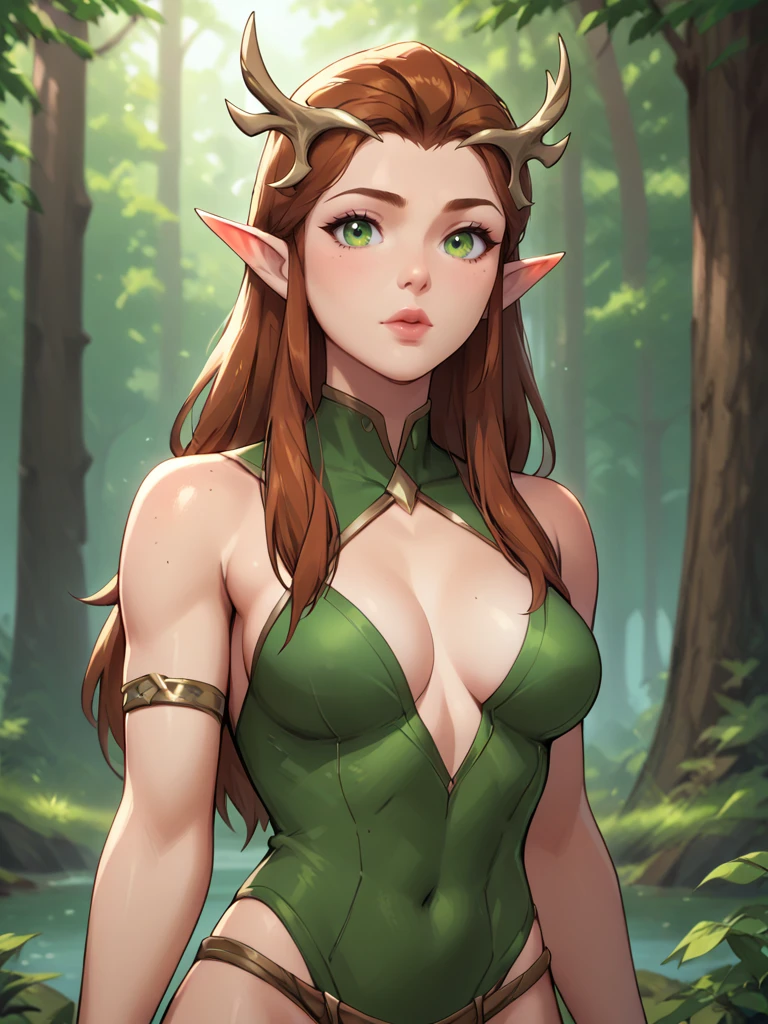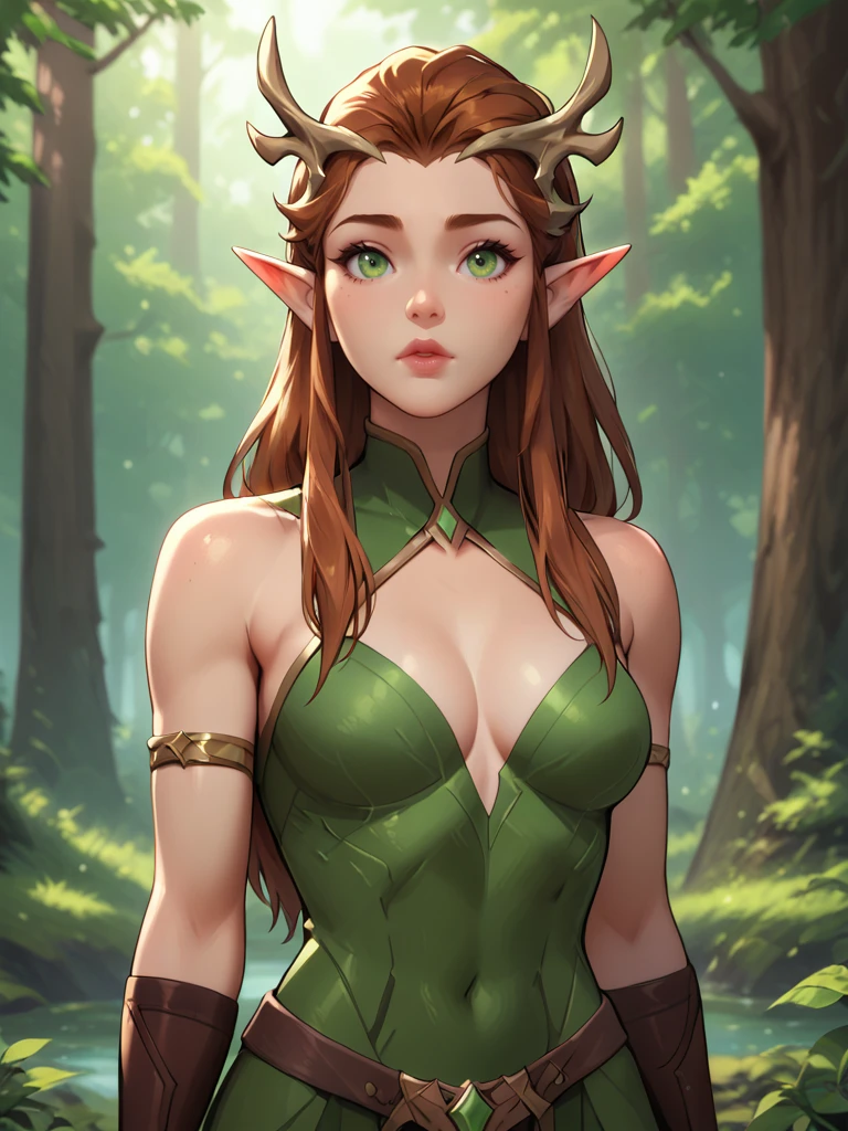 Keyleth, 1girl, brown hair, elf, green eyes, details lips, long hair,