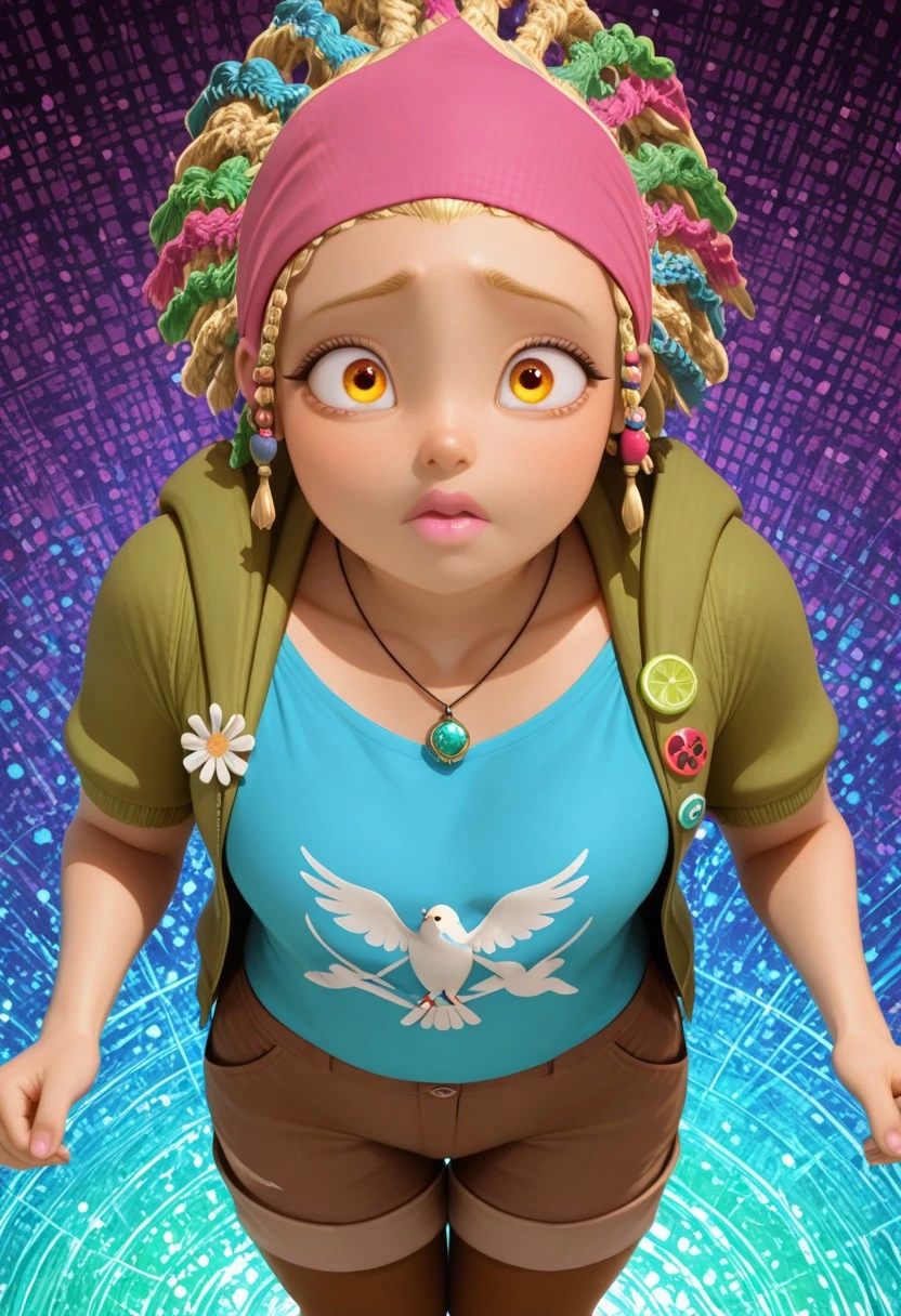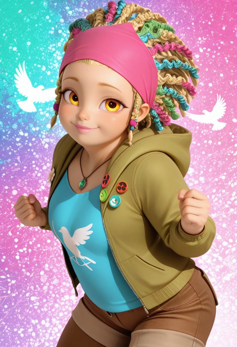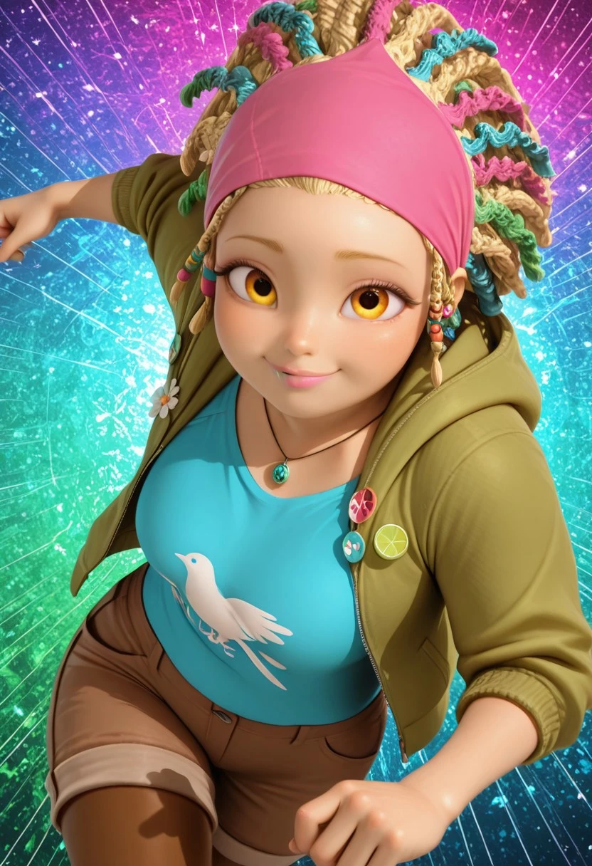 pink bandana, necklace with teal stone pendant, azure-blue t-shirt, white bird-design on t-shirt, lime-green jacket, hood down, brown shorts, shorts, rolled shorts, brown leggings, dark-purple sneakers with white toe, white soles,