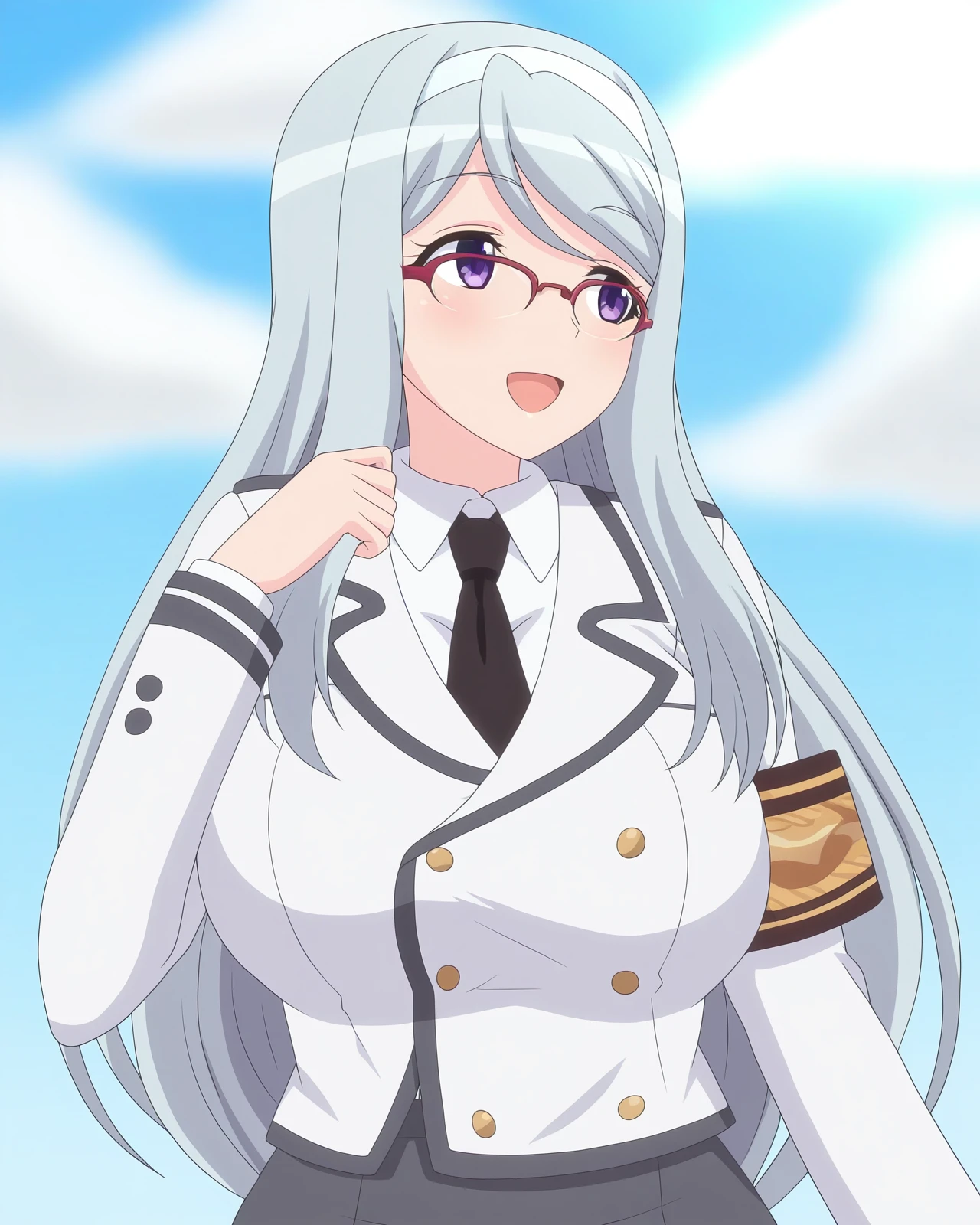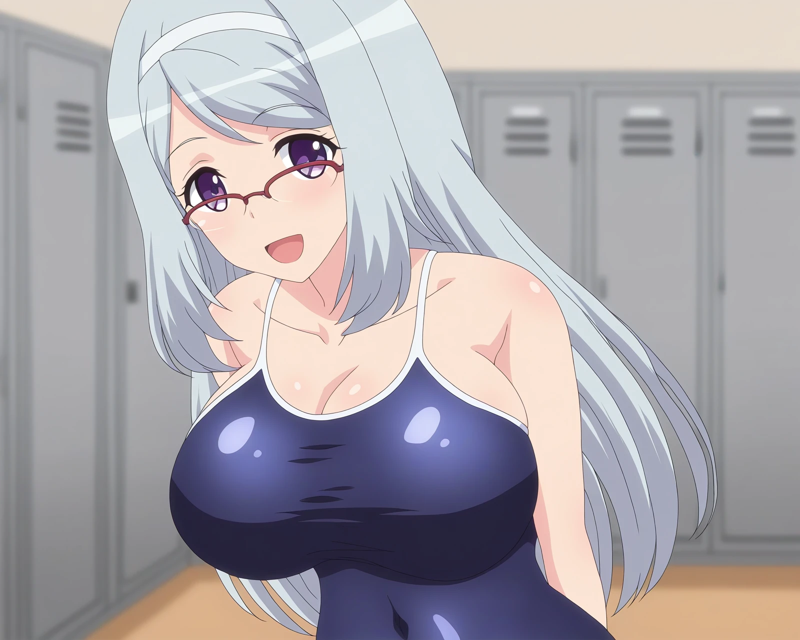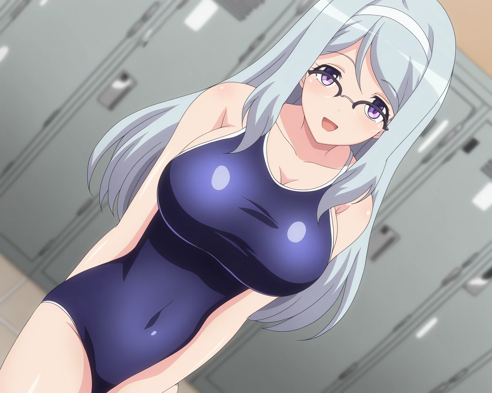 sizuru takahama,1girl,breasts,glasses,long hair,[purple eyes|blue eyes],hairband,over-rim eyewear,[blue hair|grey hair]