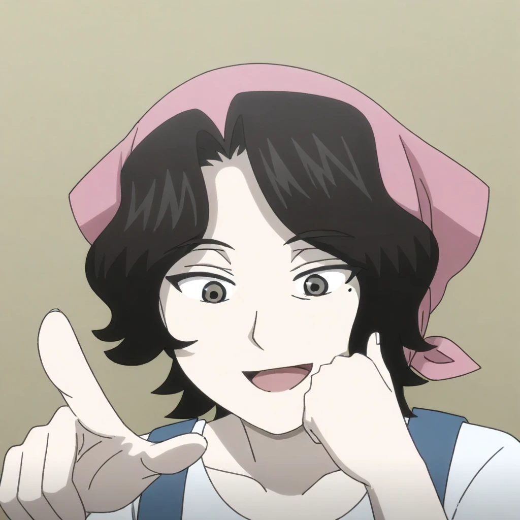 source_anime, mori_marie, mori_marie_hair, medium breasts, grey_eyes, eye wrinkle, mori_marie_shirt, red apron, mature female, pink bandana, dutch angle, smile, open mouth, hand on cheek, head tilt, upper body, dutch angle