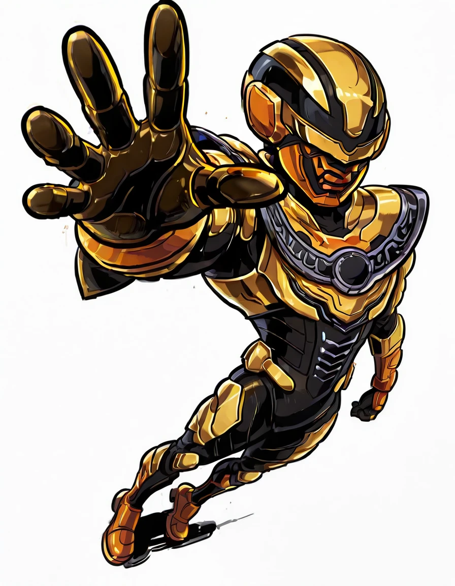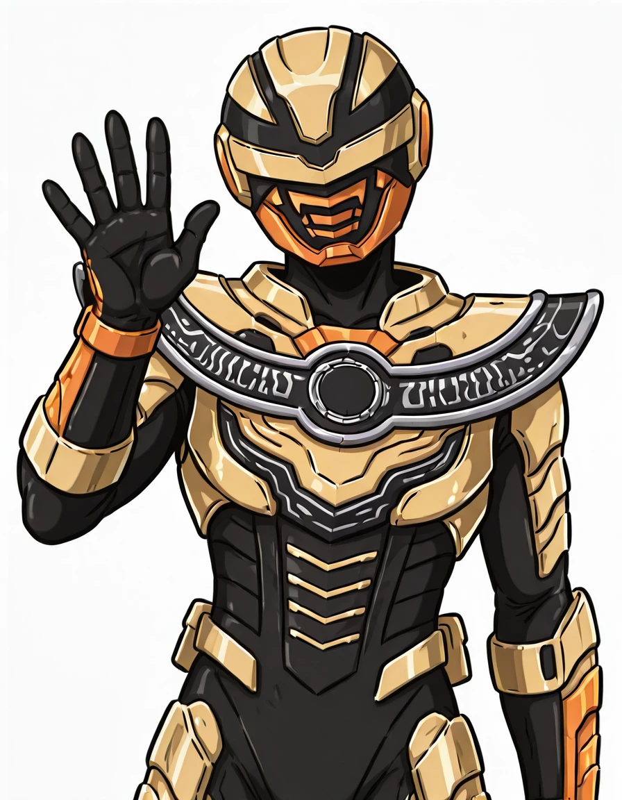 Luminous: pluminous, tokusatsu, solo, armored_suit, helmet, masked, rider_belt, gloves, boots, breasts, pluminous_helmet, pluminous_bodysuit, pluminous_belt, pluminous_gloves, pluminous_boots, pluminous_gold_armor, pluminous_orange_faceplate, pluminous_black_stripes, pluminous_silver_chest_ring