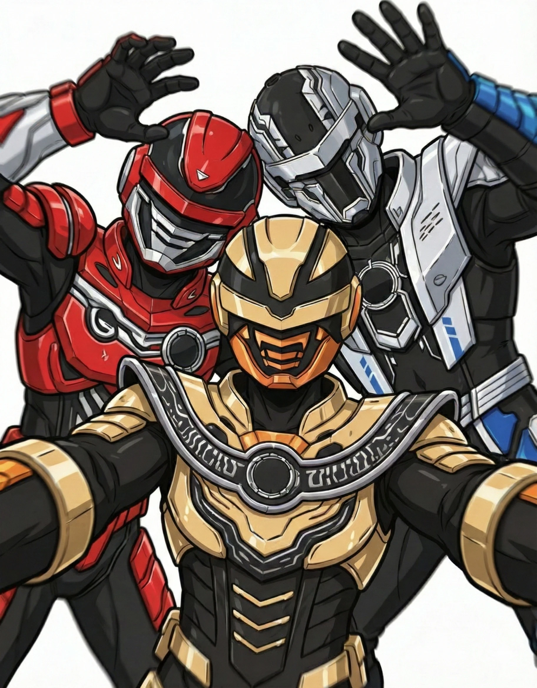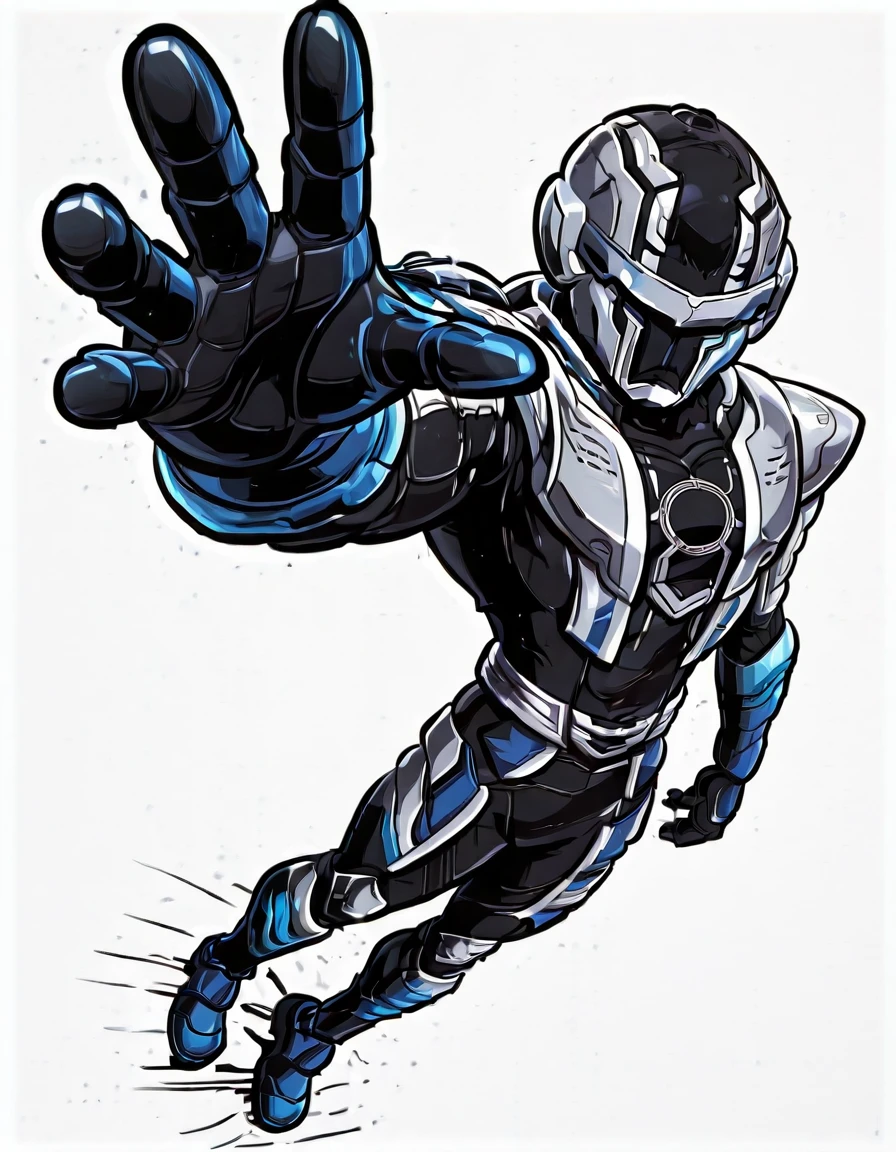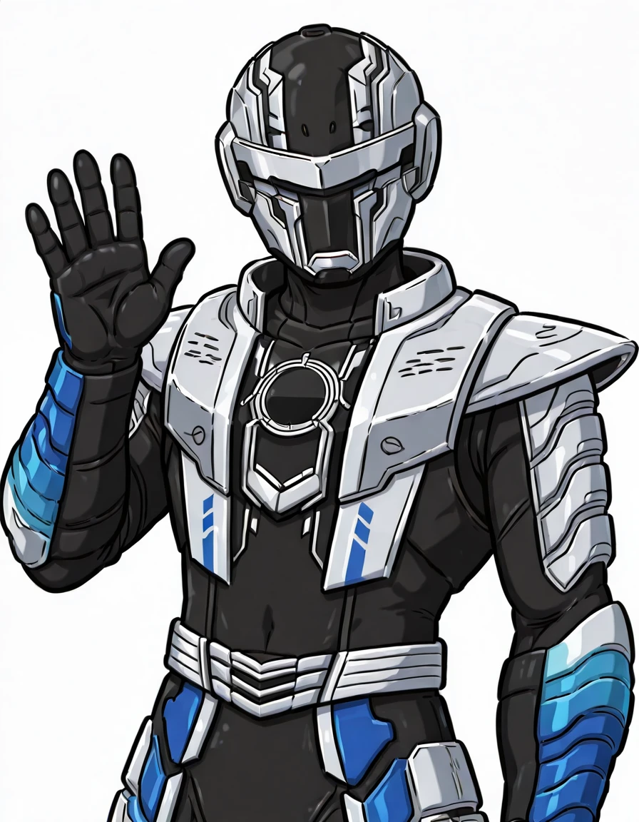 Bushido: prbushido, tokusatsu, solo, armored_suit, helmet, masked, rider_belt, gloves, boots, prbushido_helmet, prbushido_bodysuit, prbushido_belt, prbushido_gloves, prbushido_boots, prbushido_black_suit, prbushido_silver_armor, prbushido_blue_accents