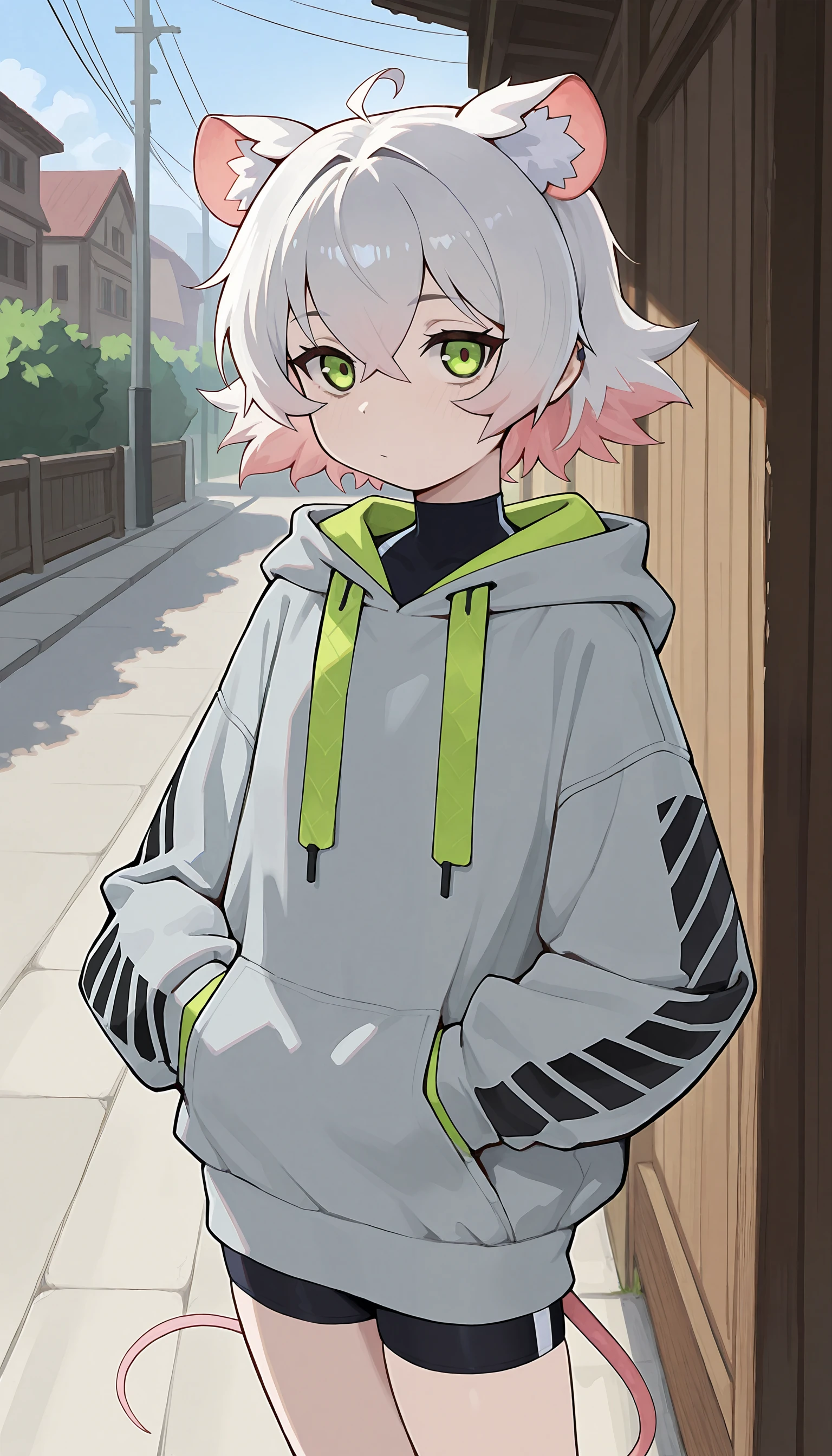 grey hoodie, long sleeves, black shorts, bike shorts, white socks, hood down, shoes,