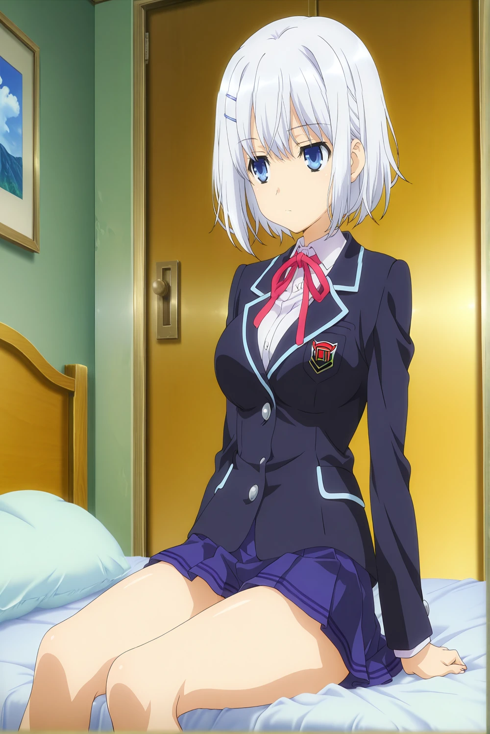 School uniform: origami, 1girl, short hair, white hair, bangs, blue eyes, hair ornament, hairclip, breasts, skirt, school uniform, jacket, blazer, ori-uniform, anime_style