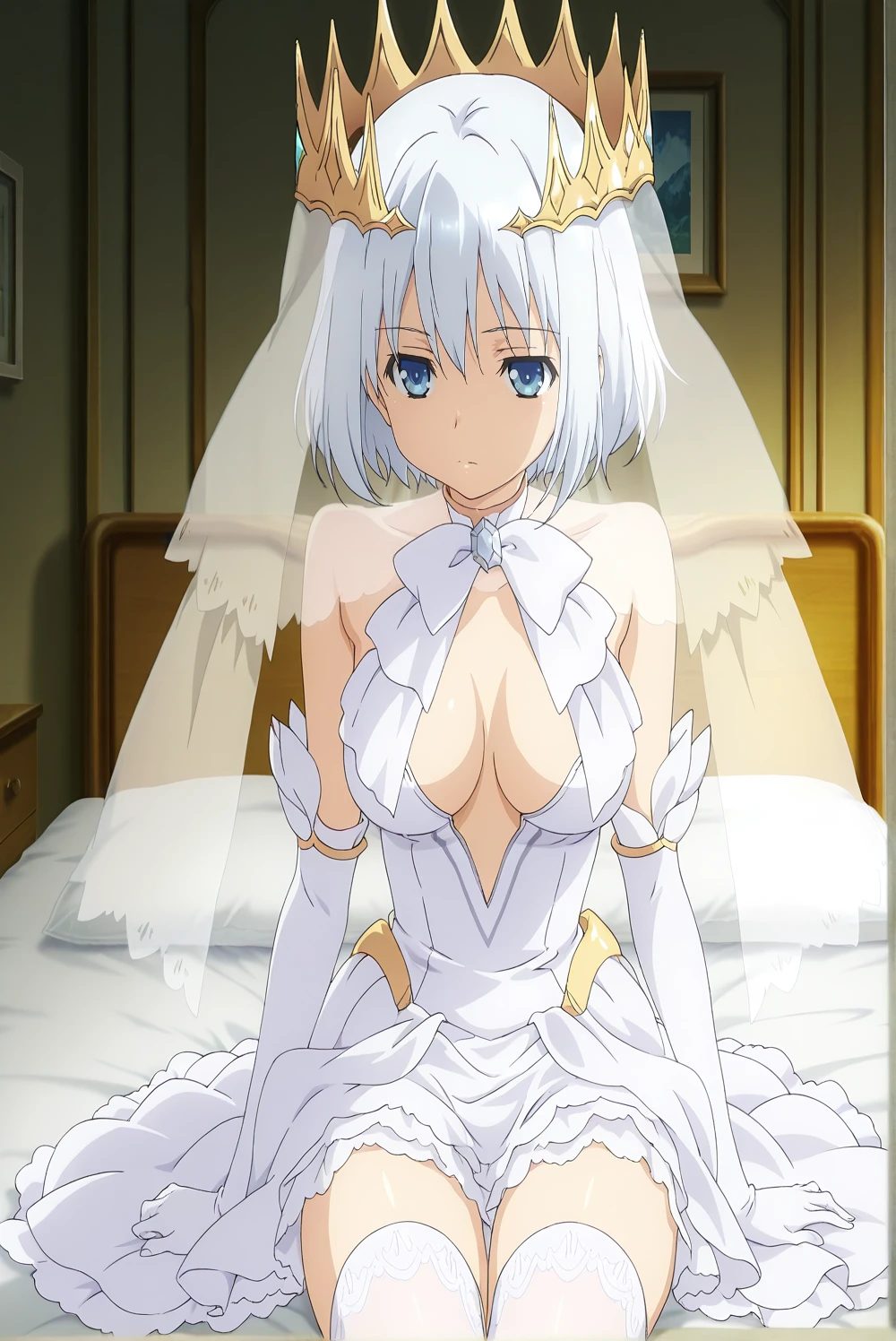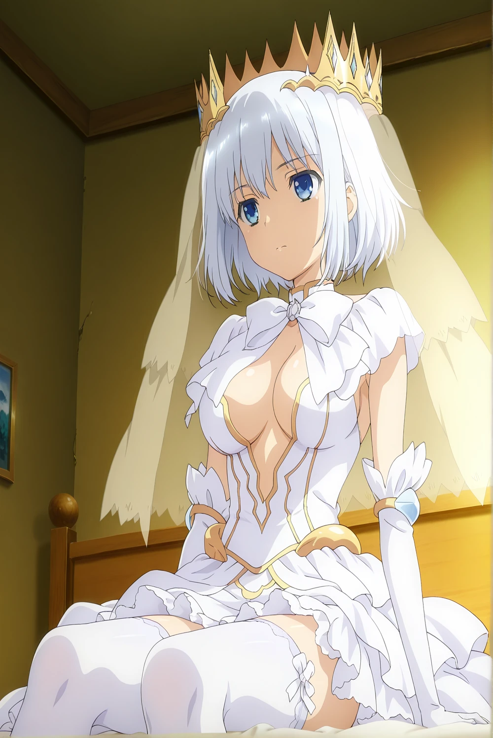 Astral Dress: origami, 1girl, short hair, white hair, bangs, blue eyes, breasts, dress, crown, bow, veil, gloves, bow, elbow gloves, white dress, open neckline. thighhighs, white thighhighs, white gloves, anime_style, ori-astral