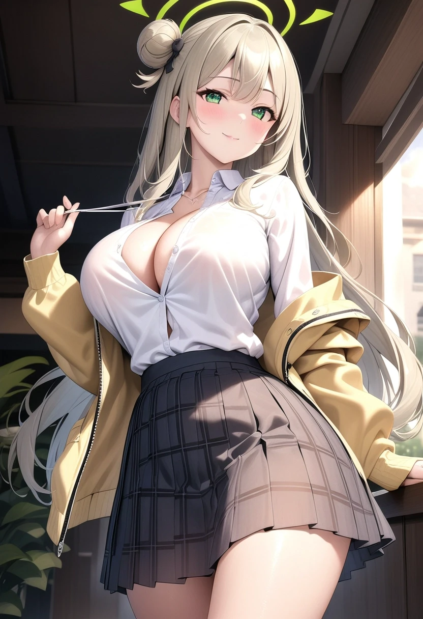 nonomi_a_xl, nonomi (blue archive), halo, long hair, blonde hair, single side bun, bangs, green eyes, large breasts,
