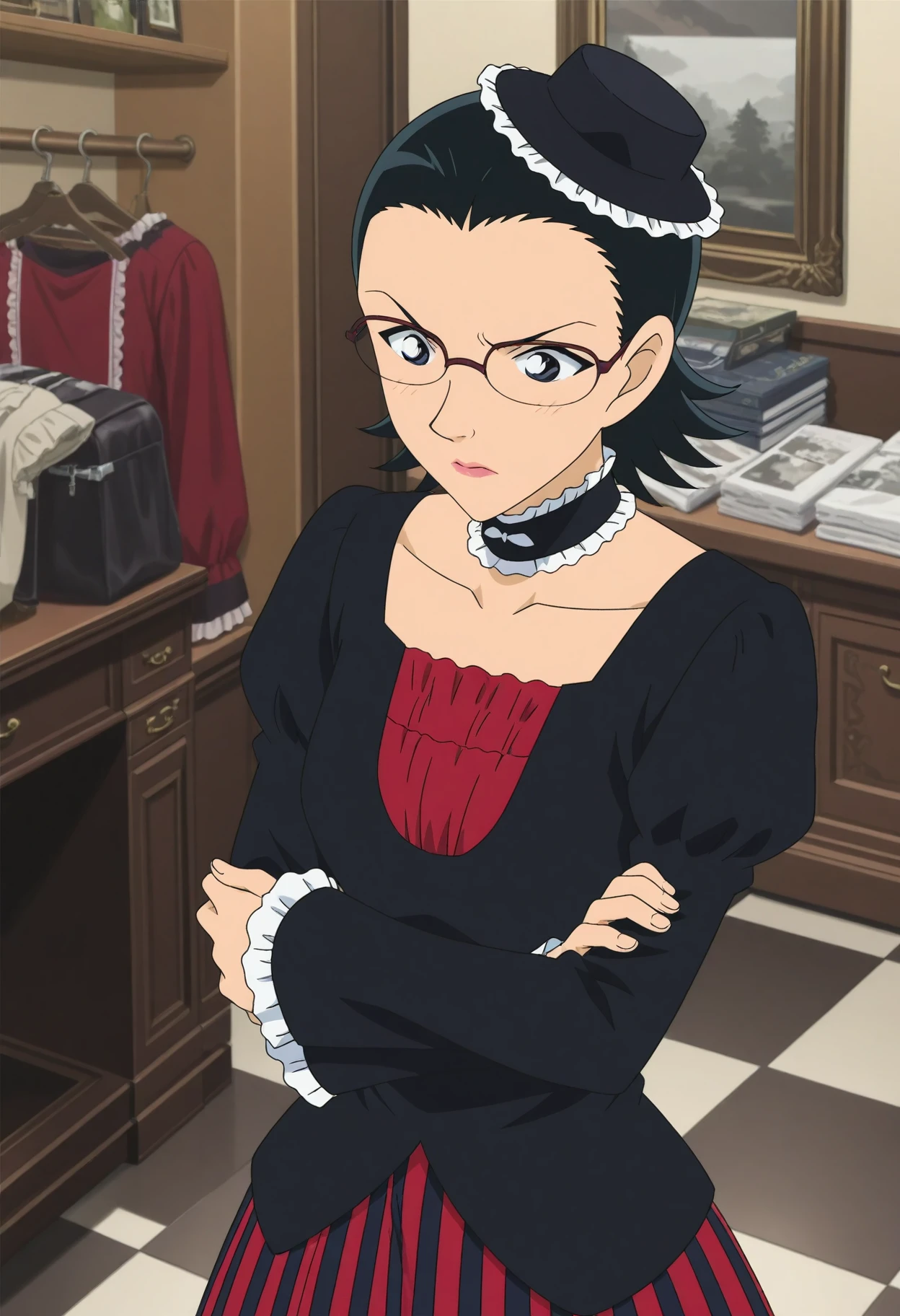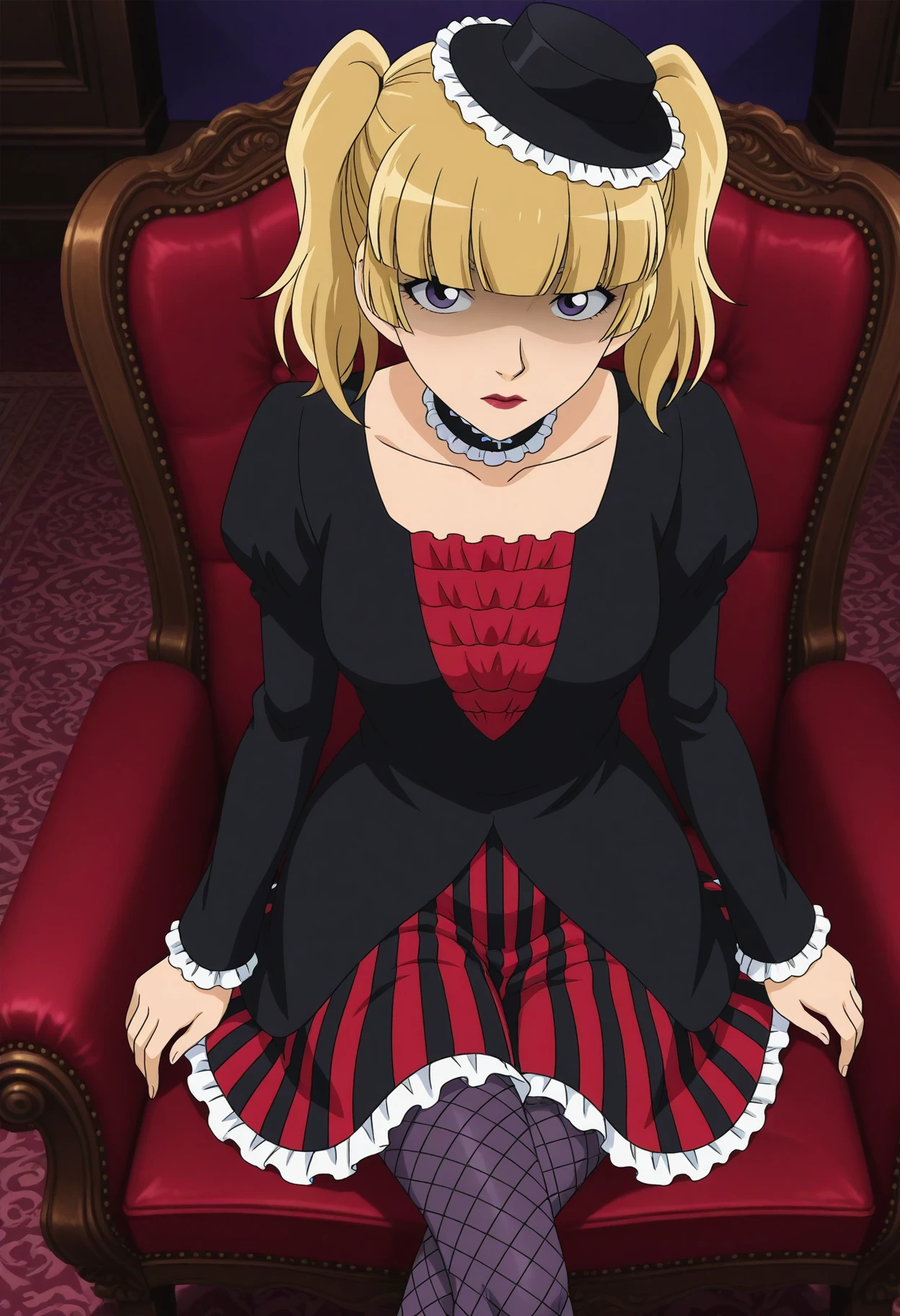 gtlg, blonde hair, twintails, blunt bangs,wig, eyebrows hidden by hair, purple eyes,pale skin,dark red lips,lipstick,makeup,black headwear,tilted headwear,mini hat,frilled hat,frilled choker,black choker,emblem,