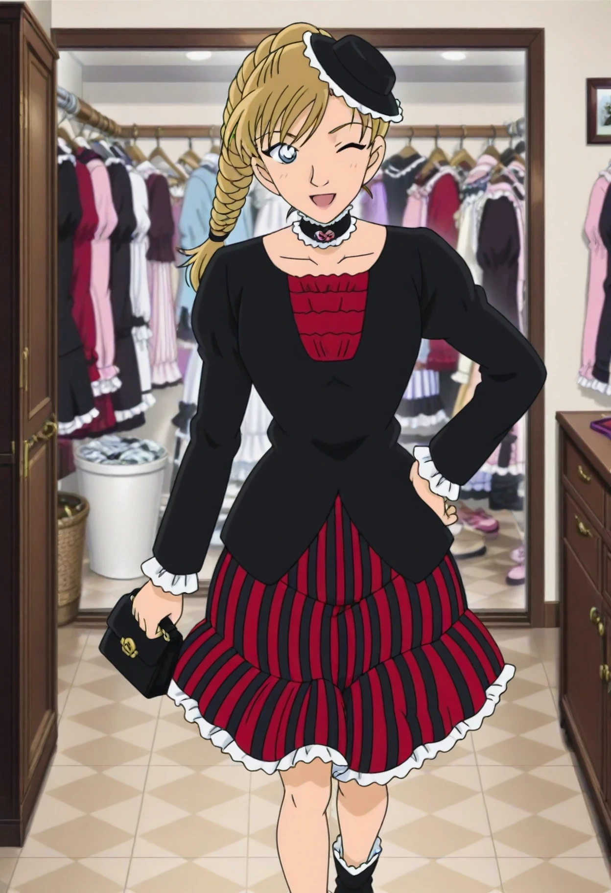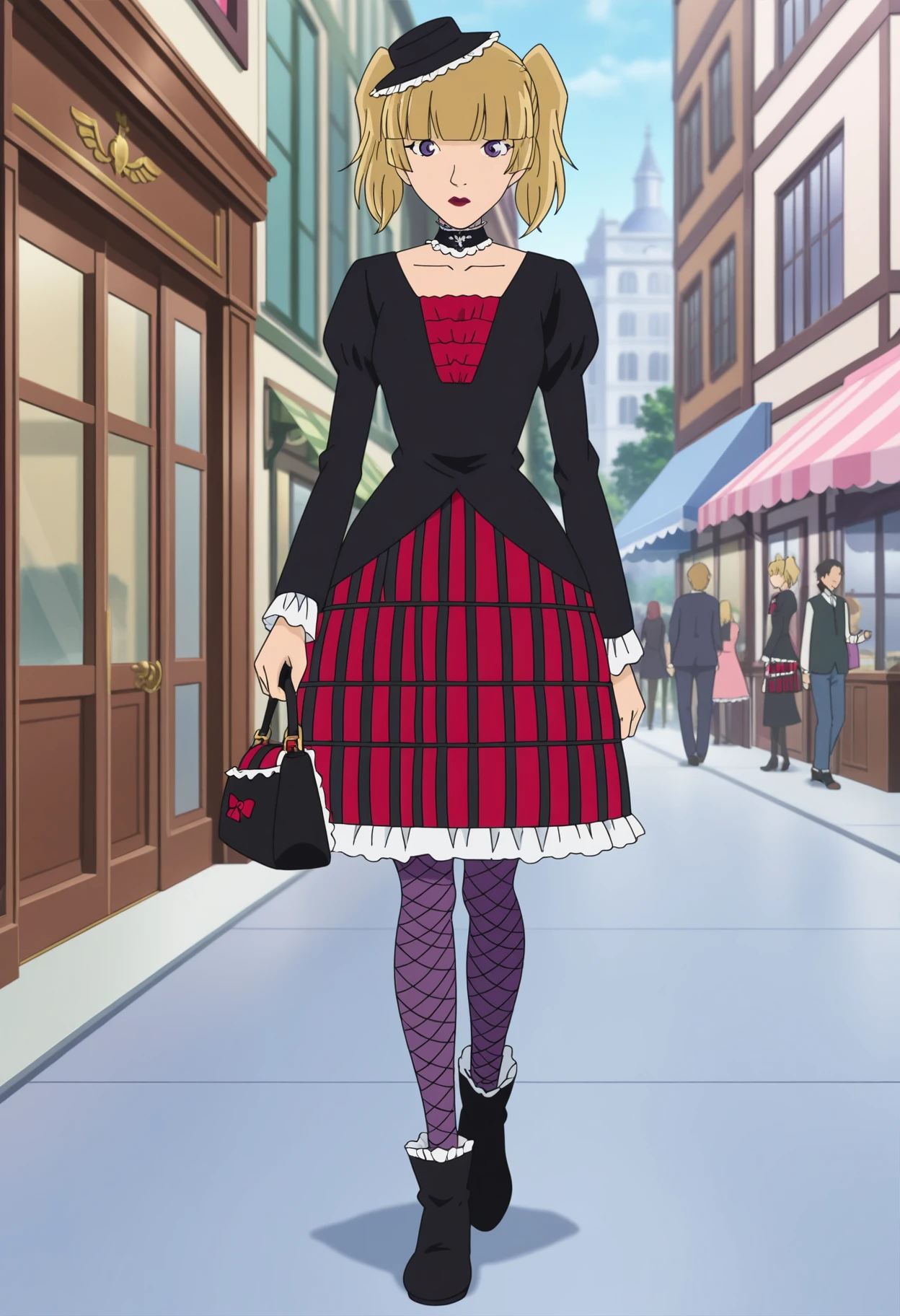 collarbone,red frills, black dress, red dress,gothic lolita, long sleeves, juliet sleeves, frilled dress, vertical-striped skirt, red skirt, black skirt,fishnet pantyhose,purple pantyhose,ankle boots,black boots,frilled boots,black handbag,frilled bag,bag ribbon, cosplay, goth fashion,disguise,