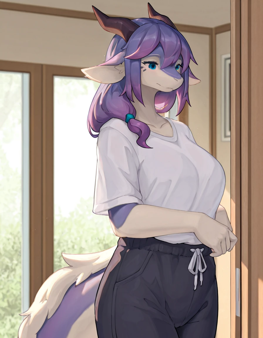 lanya_lcshian, horn, purple_hair, blue_eyes, long_hair