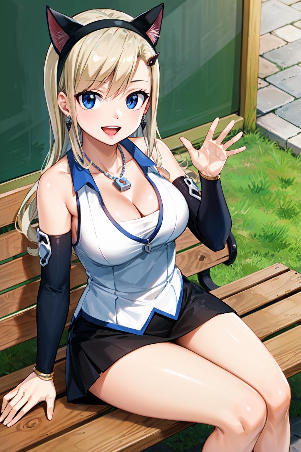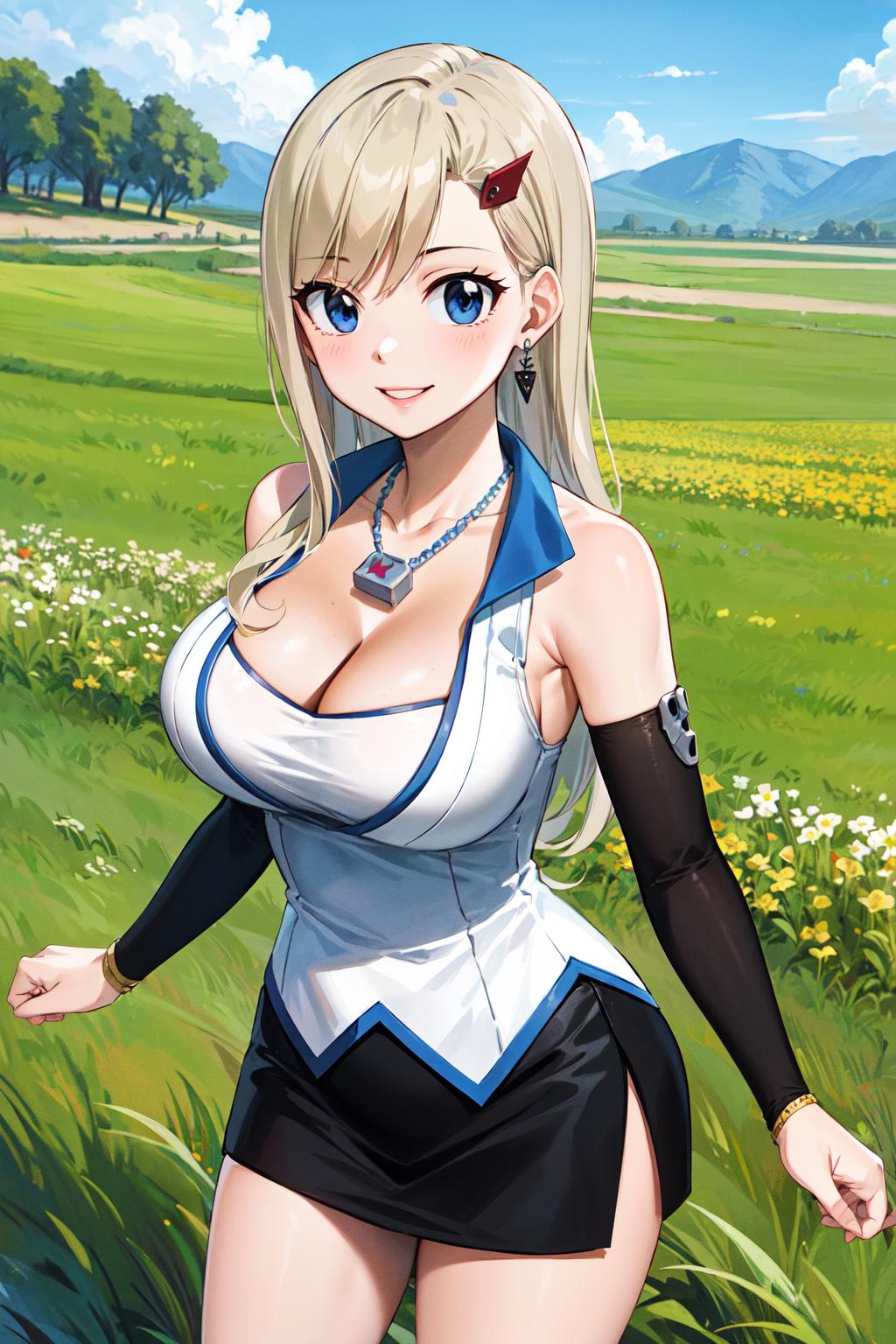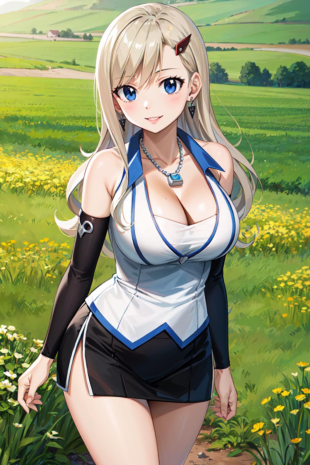 outfit1hmrb, long hair, hair ornament, hairclip, earrings, necklace, cleavage, white shirt, sleeveless, detached sleeves, miniskirt, black skirt
