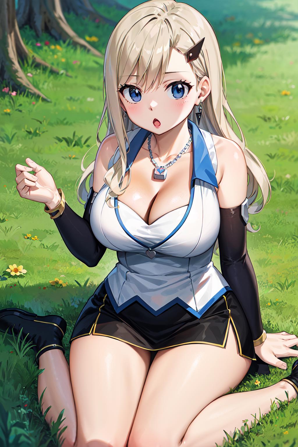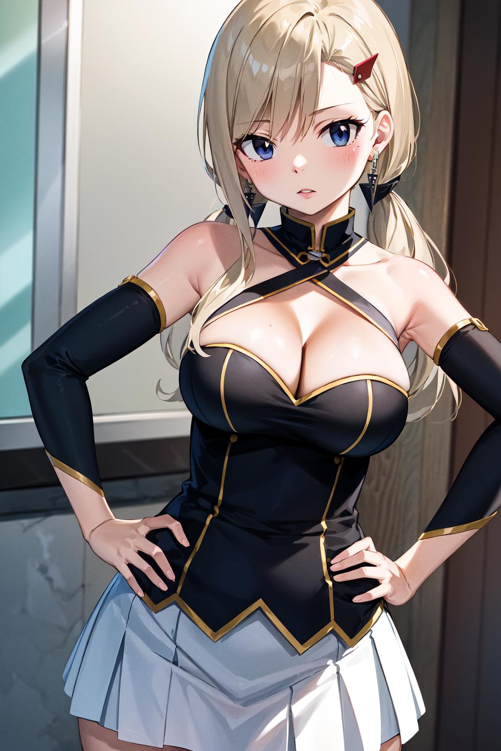 hmrb, long hair, hair ornament, hairclip, earrings, necklace, cleavage, white shirt, sleeveless, detached sleeves, miniskirt, black skirt