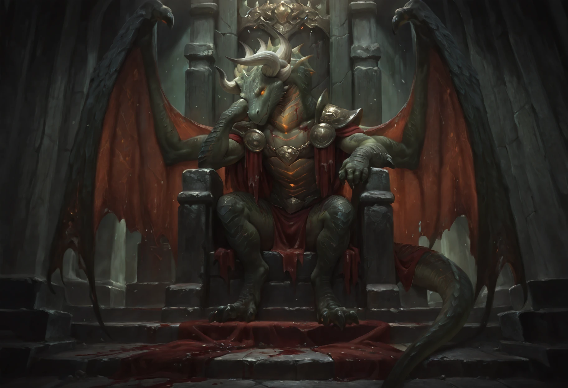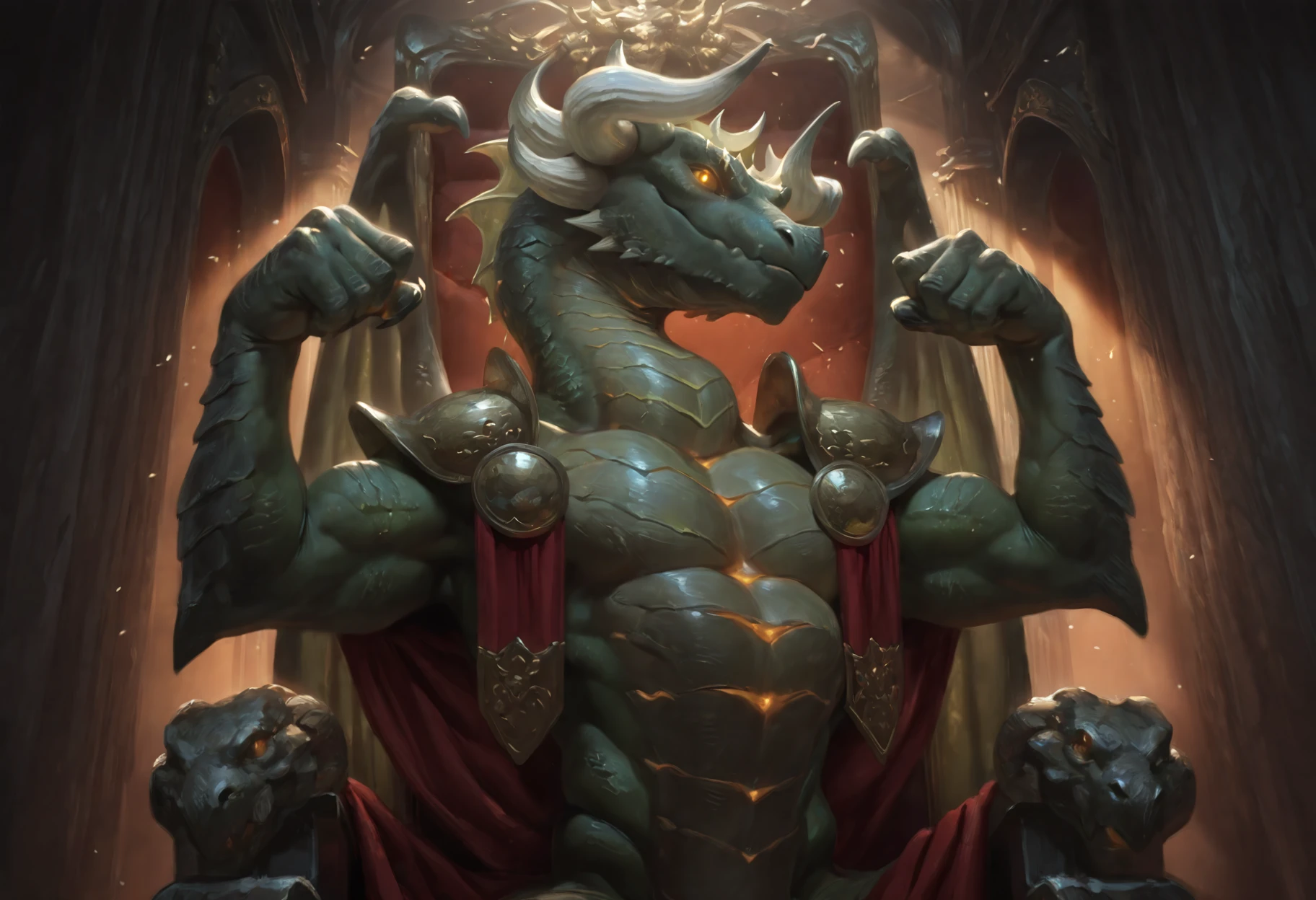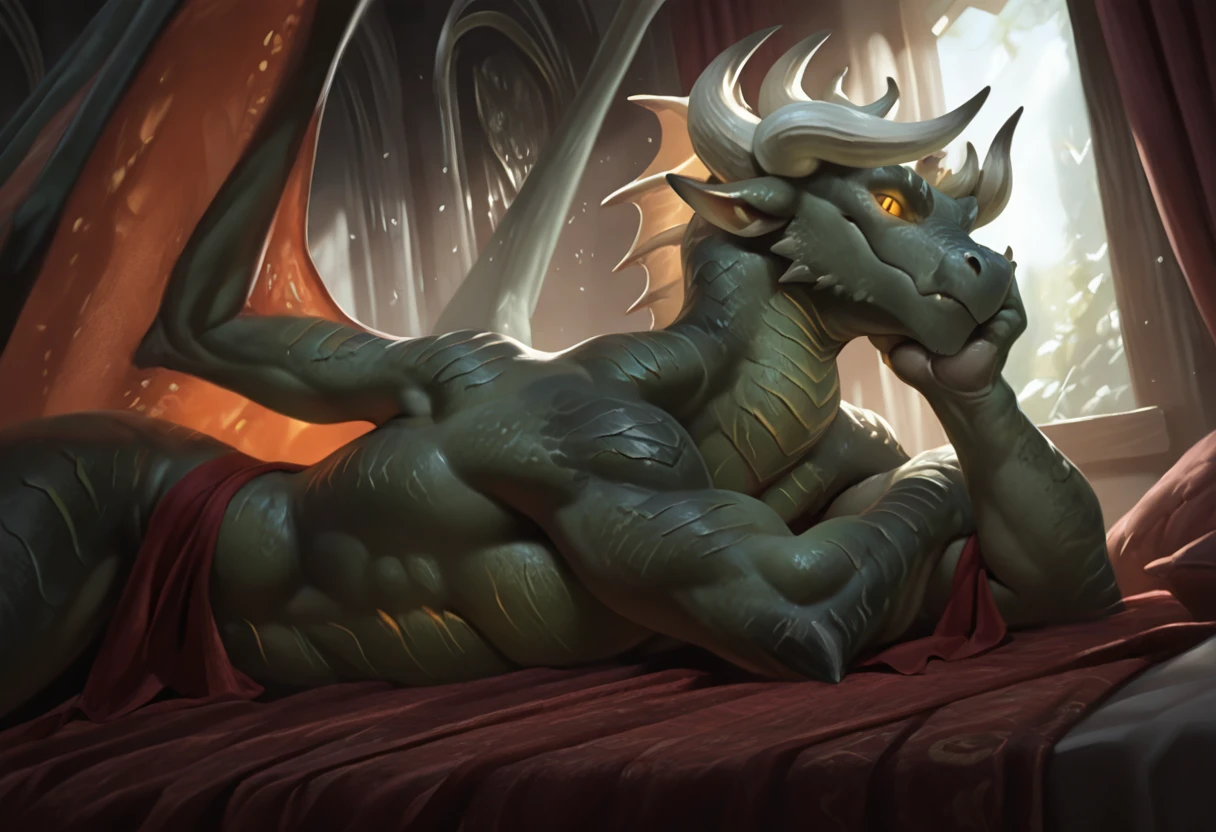 Tags: semi-anthro, dragon, green scales, shoulder armor, red cloth strips, glowing eyes, orange eyes, horns, tail, wings