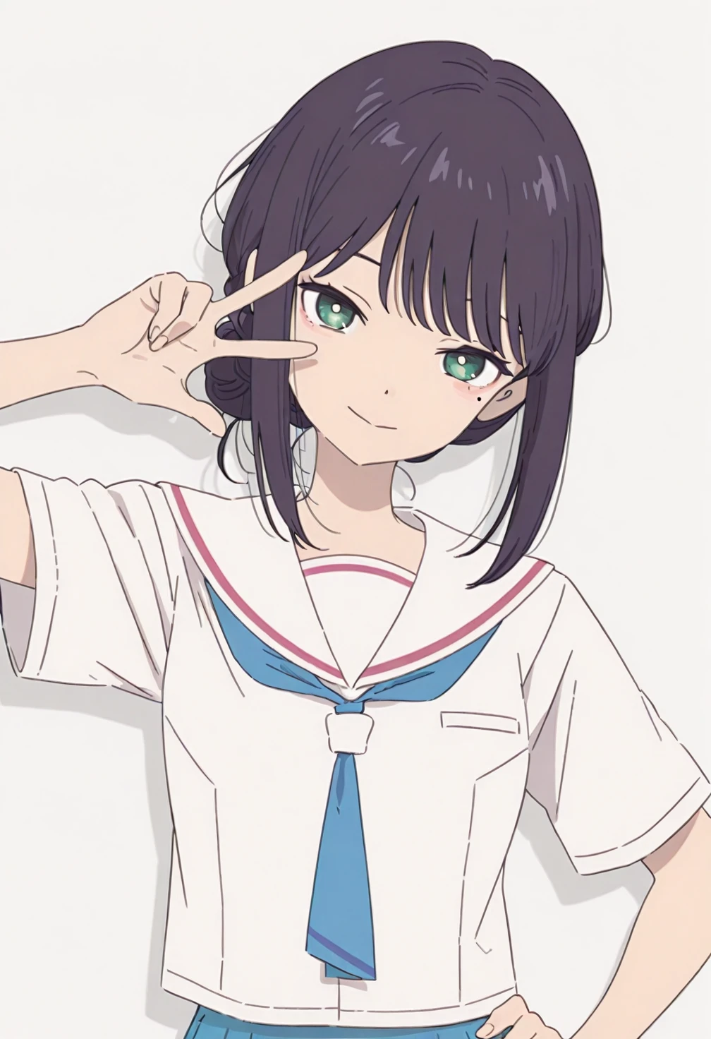 Sakayori Iroha,green eyes,black hair,short hair,single hair bun,sidelocks,bangs,mole,mole under eye,ch2 school uniform,ch2 serafuku,ch2 white sailor collar,ch2 blue neckerchief,ch2 white shirt,ch2 collared shirt,ch2 short sleeves,ch2 blue skirt,ch2 pleated skirt,ch2 white socks,ch2 ankle socks,ch2 loafers,ch2 black footwear,costume3