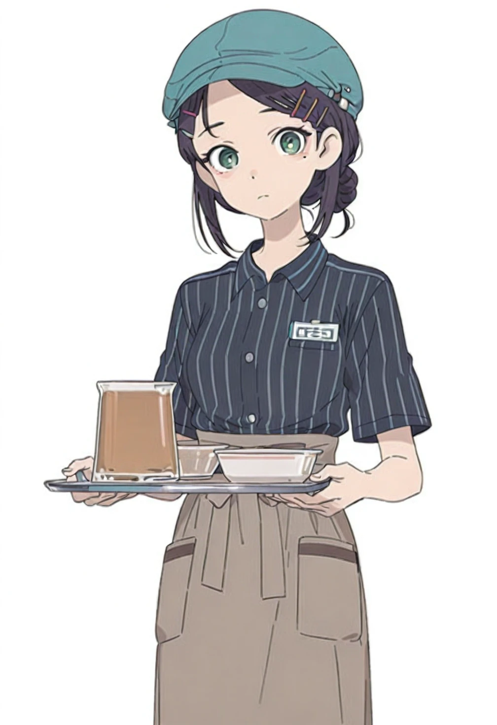 Sakayori Iroha,green eyes,black hair,short hair,mole,mole under eye,single hair bun,ch3 hair ornament,ch3 hairclip,ch3 cabbie hat,ch3 teal headwear,ch3 waitress,ch3 employee uniform,ch3 dark grey shirt,ch3 collared shirt,ch3 vertical-striped shirt,ch3 buttons,ch3 short sleeves,ch3 name tag,ch3 brown apron,ch3 pocket,ch3 dark green pants,ch3 white socks,ch3 shoes,ch3 black footwear,costume4