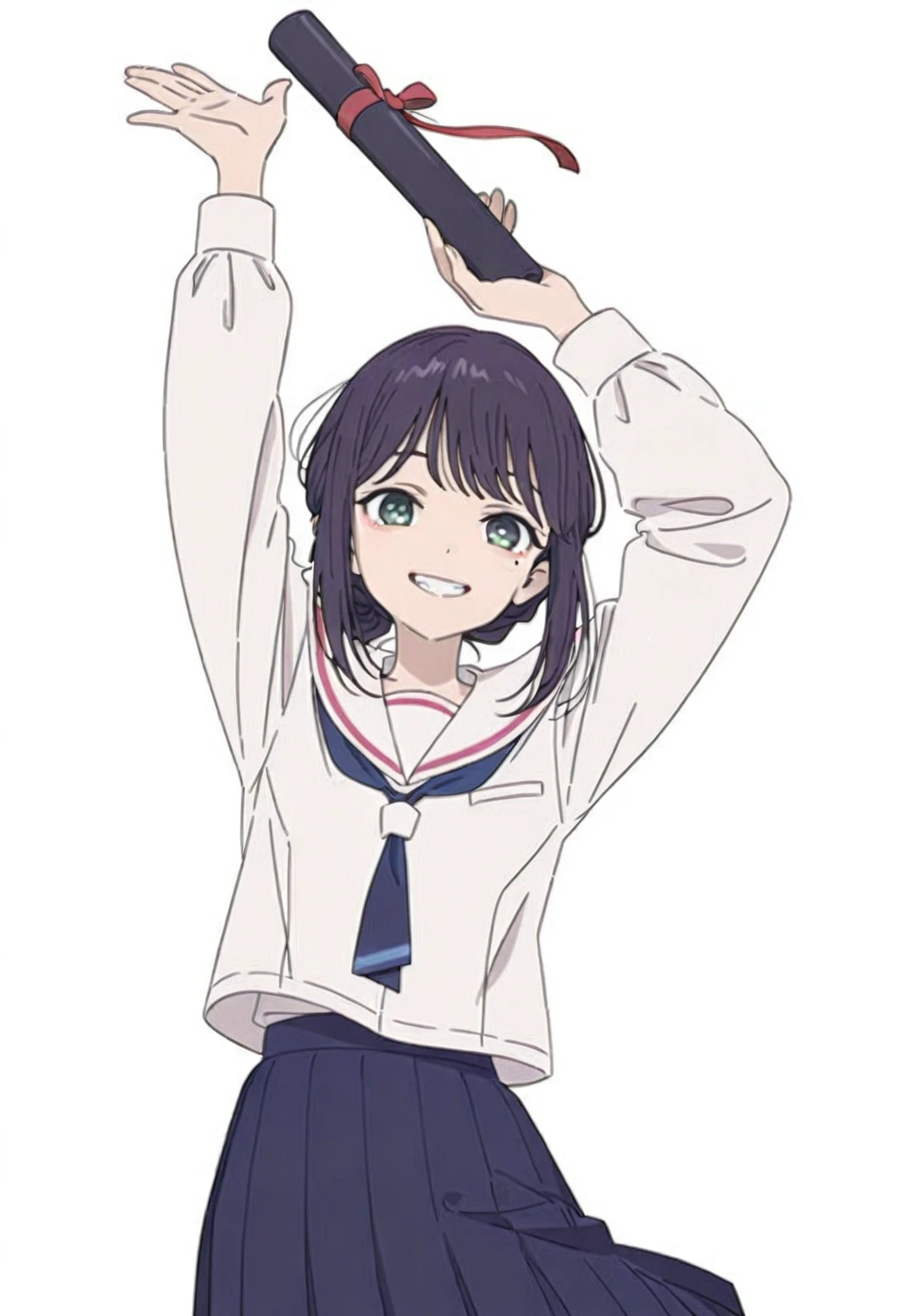 Sakayori Iroha,green eyes,black hair,short hair,single hair bun,sidelocks,bangs,mole,mole under eye,ch10 serafuku,ch10 school uniform,(ch10 winter uniform:1.1),ch10 loose clothes,ch10 sailor collar,ch10 white sailor collar,ch10 dark blue neckerchief,(ch10 white shirt:1.1),ch10 long sleeves,ch10 skirt,ch10 dark blue skirt,ch10 pleated skirt,ch10 white socks,ch10 ankle socks,ch10 loafers,ch10 black footwear,