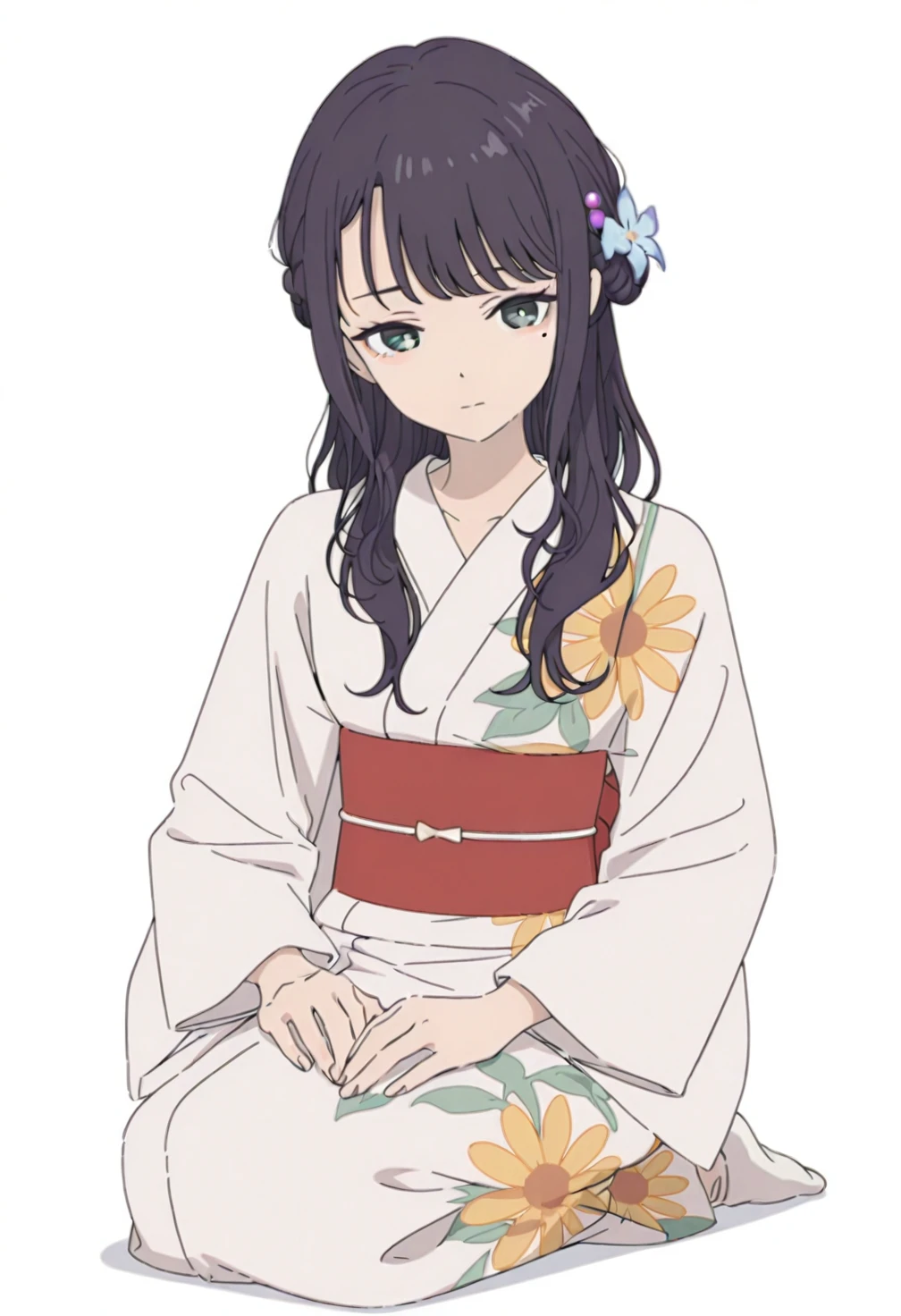 Sakayori Iroha,green eyes,black hair,long hair,bangs,sidelocks,single hair bun,half updo,braid,mole,mole under eye,ch9 hair ornament,ch9 hair flower,ch9 japanese clothes,ch9 yukata,ch9 white kimono,ch9 floral print,ch9 long sleeves,ch9 wide sleeves,ch9 sash,ch9 obi,ch9 back bow,ch9 red bow,ch9 white socks,ch9 ankle socks,ch9 sneakers,ch9 yellow footwear,ch9 shoelaces,costume10