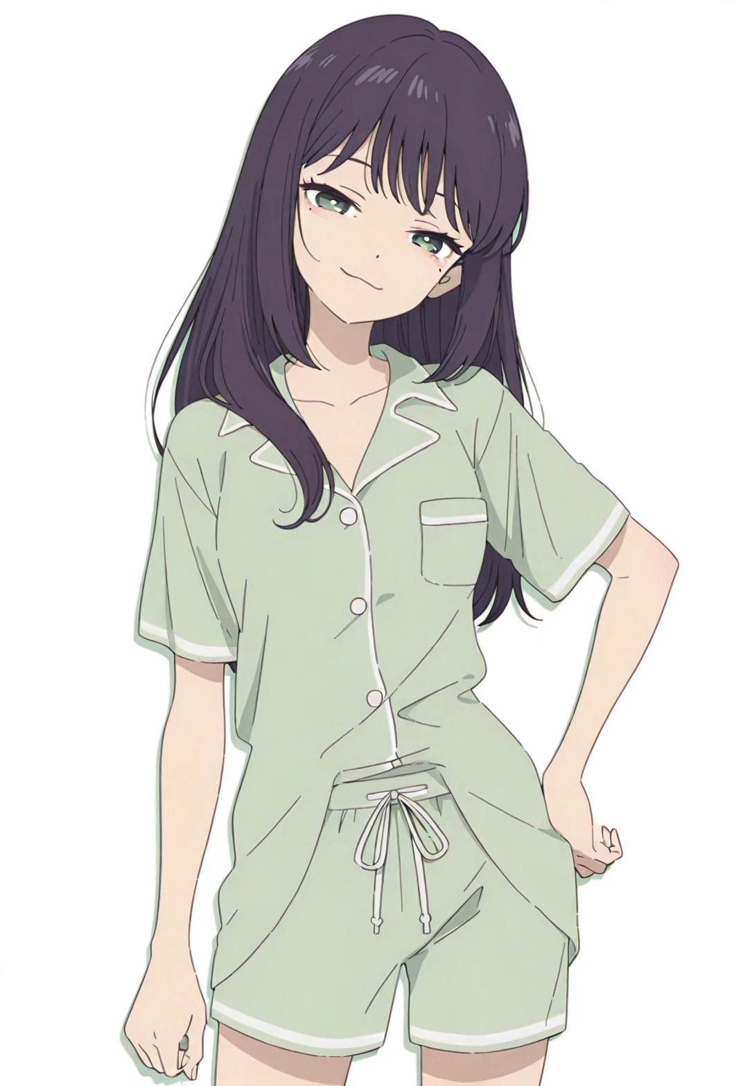 Sakayori Iroha,green eyes,mole,mole under eye,black hair,long hair,bangs,ch1 pajamas,ch1 shirt,ch1 green shirt,ch1 short sleeves,ch1 shorts,ch1 green shorts,barefoot,