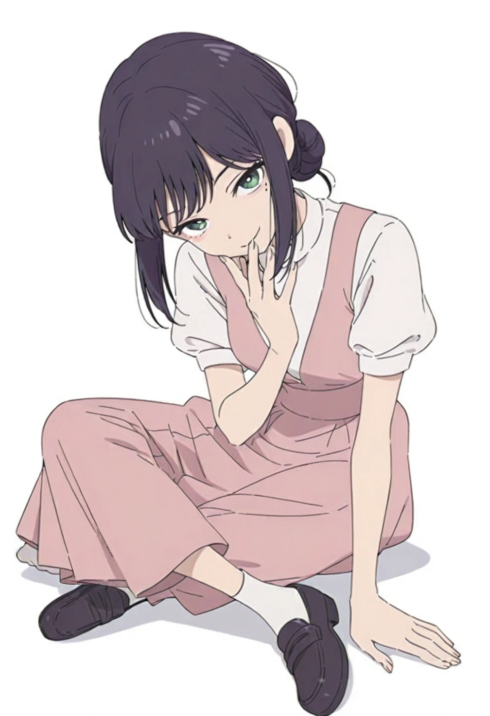 Sakayori Iroha,green eyes,black hair,short hair,single hair bun,sidelocks,bangs,mole,mole under eye,ch6 white shirt,ch6 short sleeves,ch6 juliet sleeves,ch6 pink dress,ch6 sleeveless dress,ch6 white socks,ch6 ankle socks,ch6 loafers,ch6 black footwear,costume7